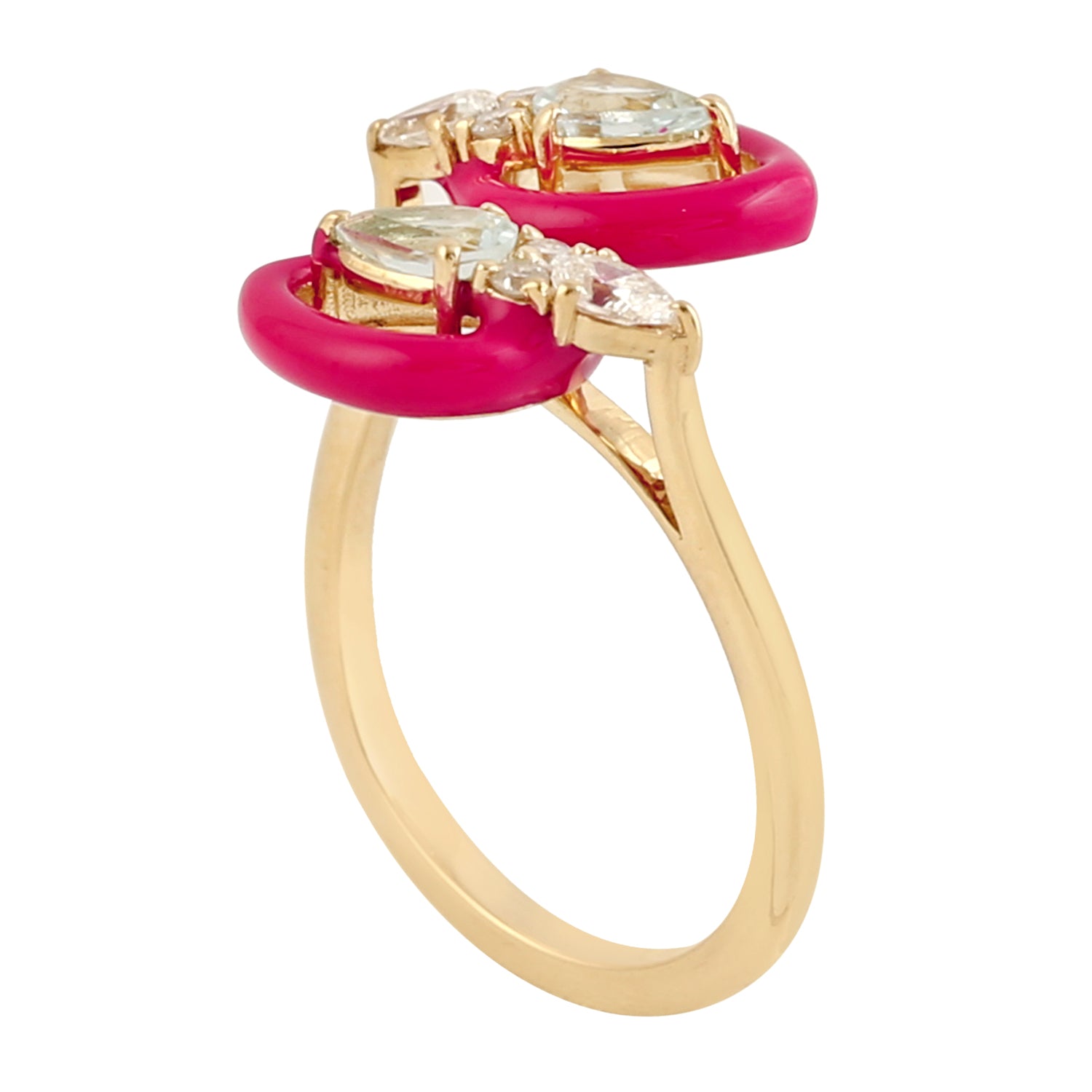 Aquamarine Gemstone Diamond Enamel Bypass Ring In 14k Yellow Gold