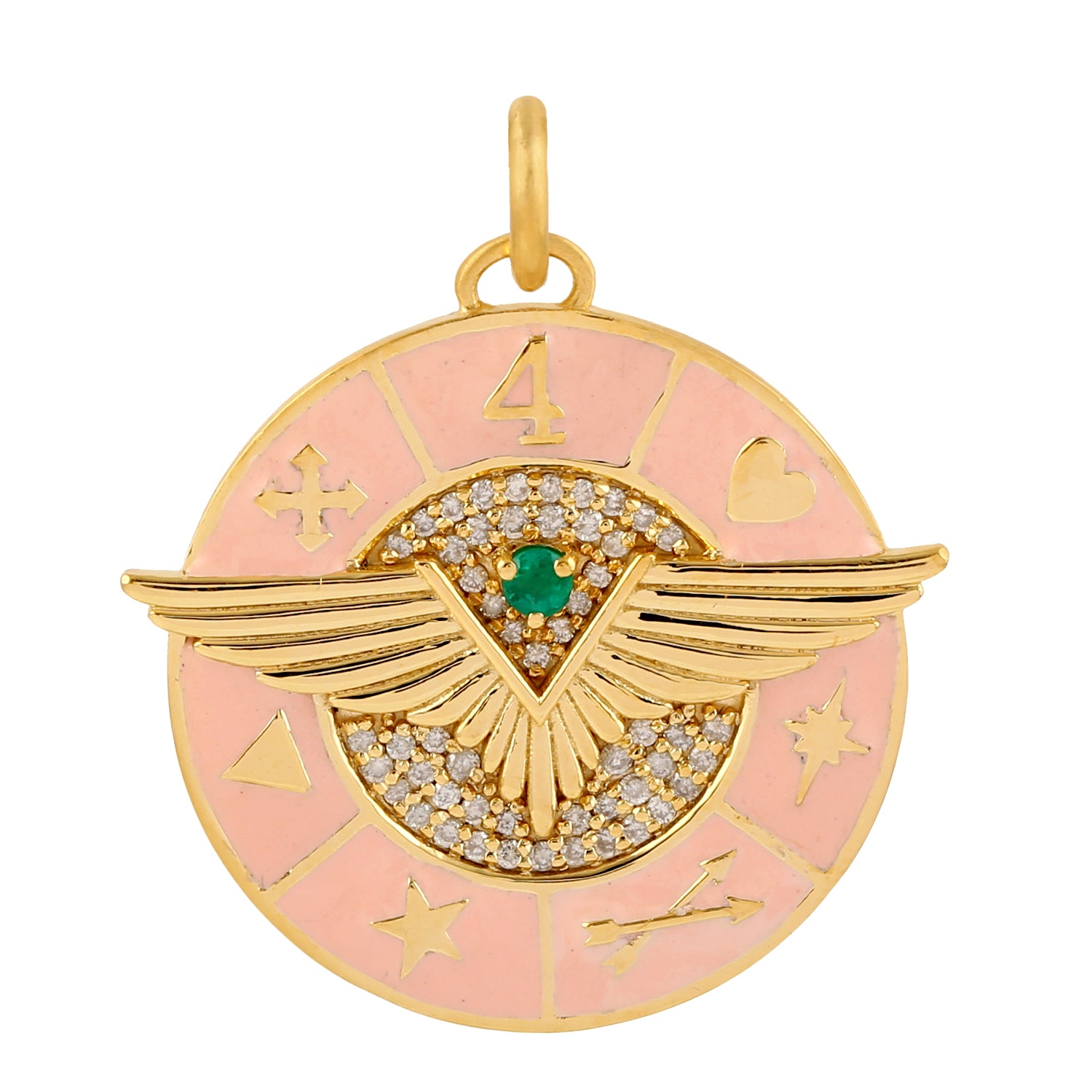 Emerald Pave Diamond Eagle Wings Enamel Pendant In 18k Yellow Gold