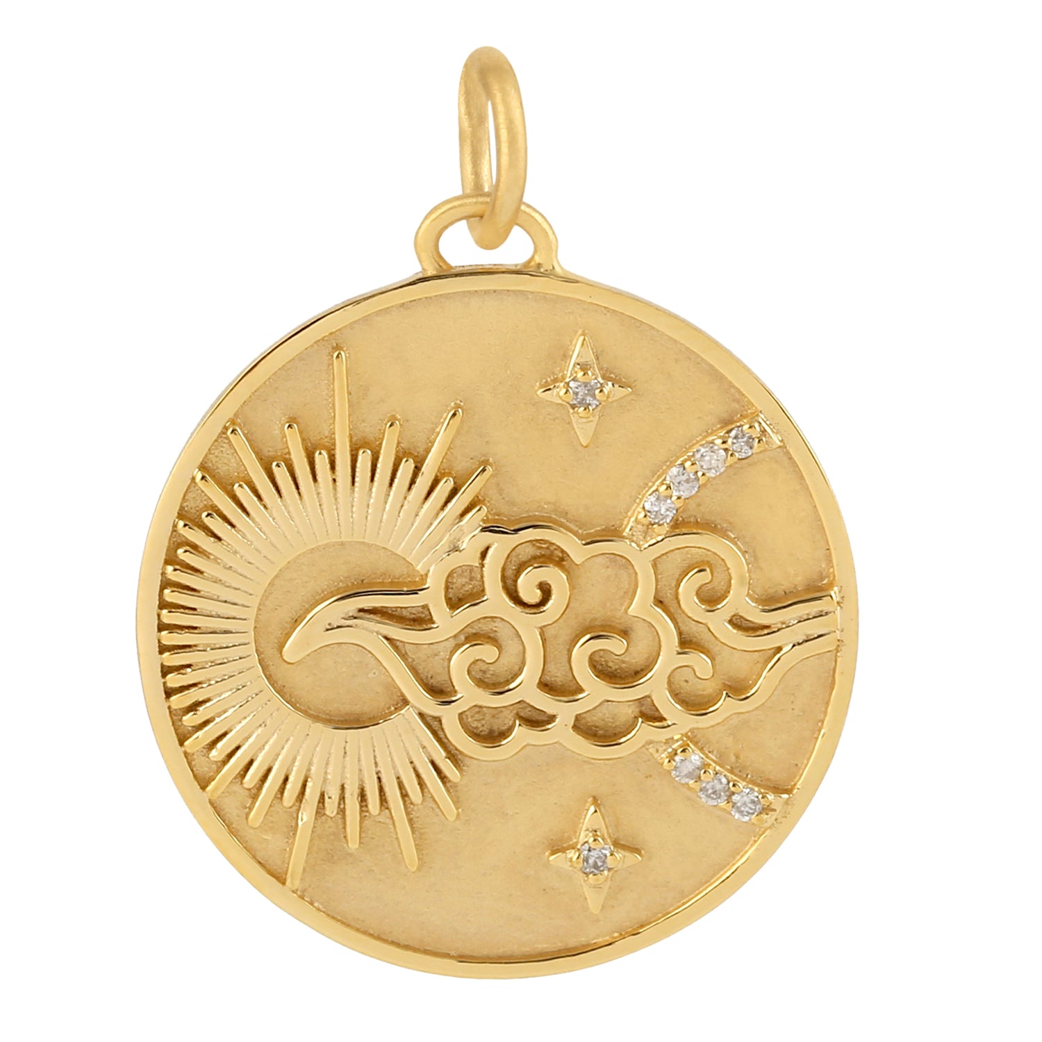 14K Yellow Gold Pave Diamond Handmade Sun Star Cloud Pendant