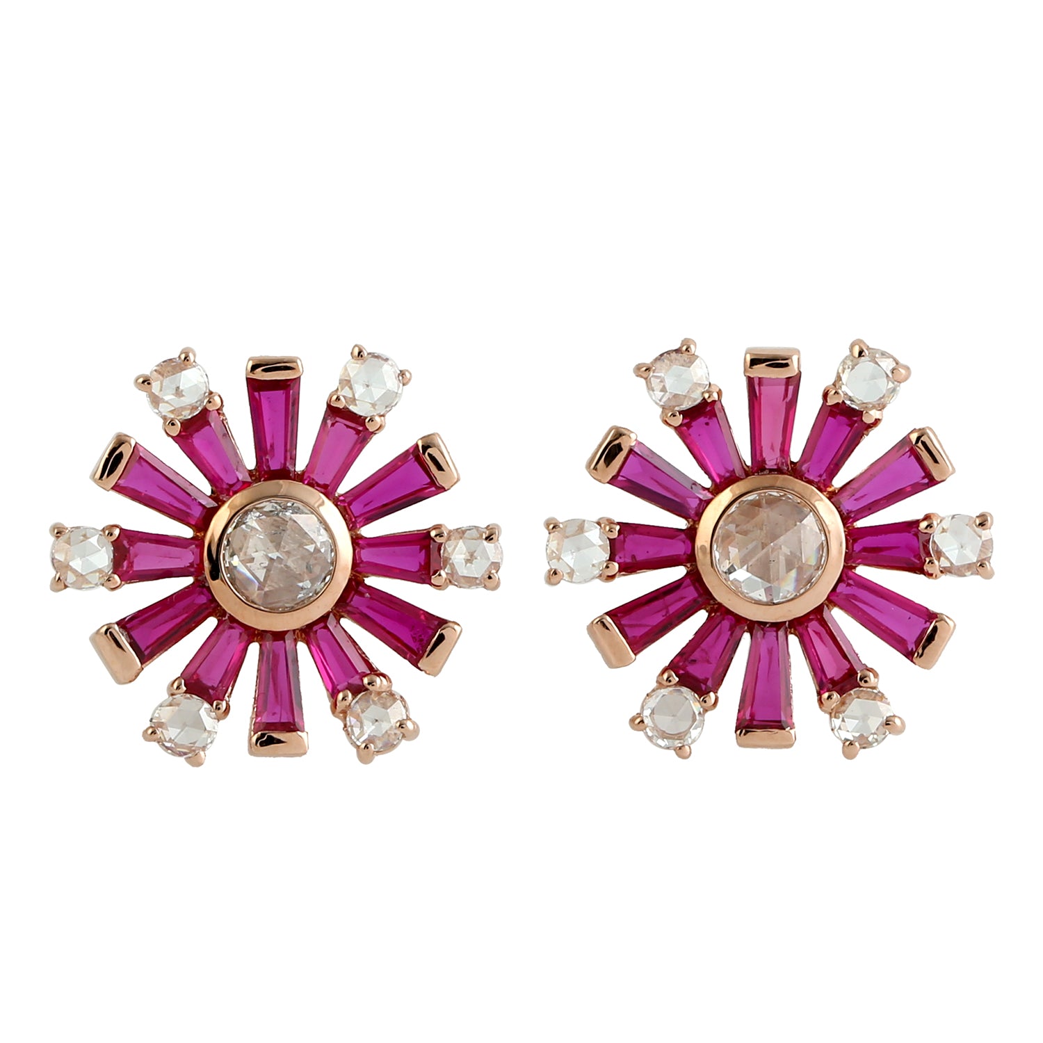 Baguette Cut Ruby Rose Cut Diamond Stud Earrings In 18K Rose Gold