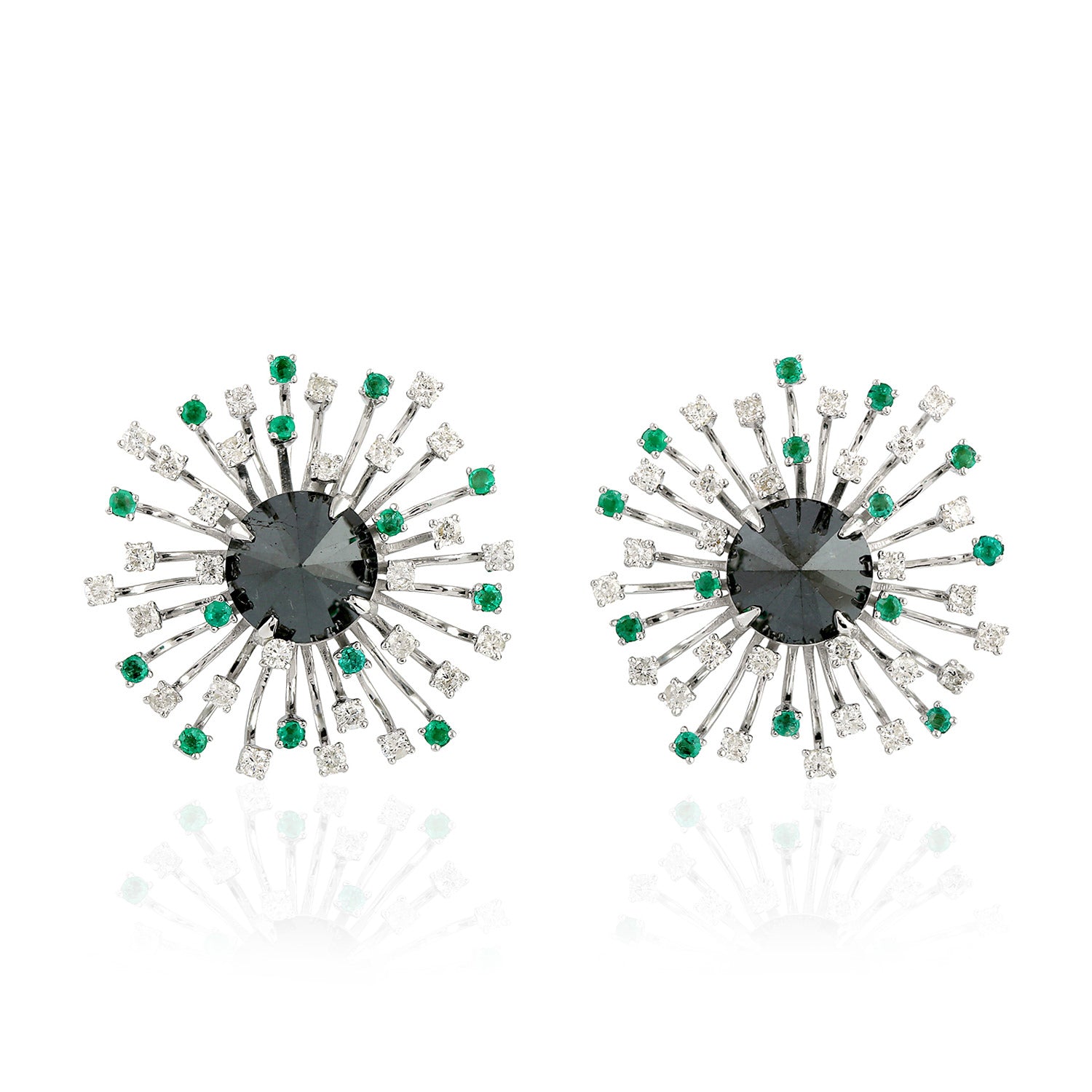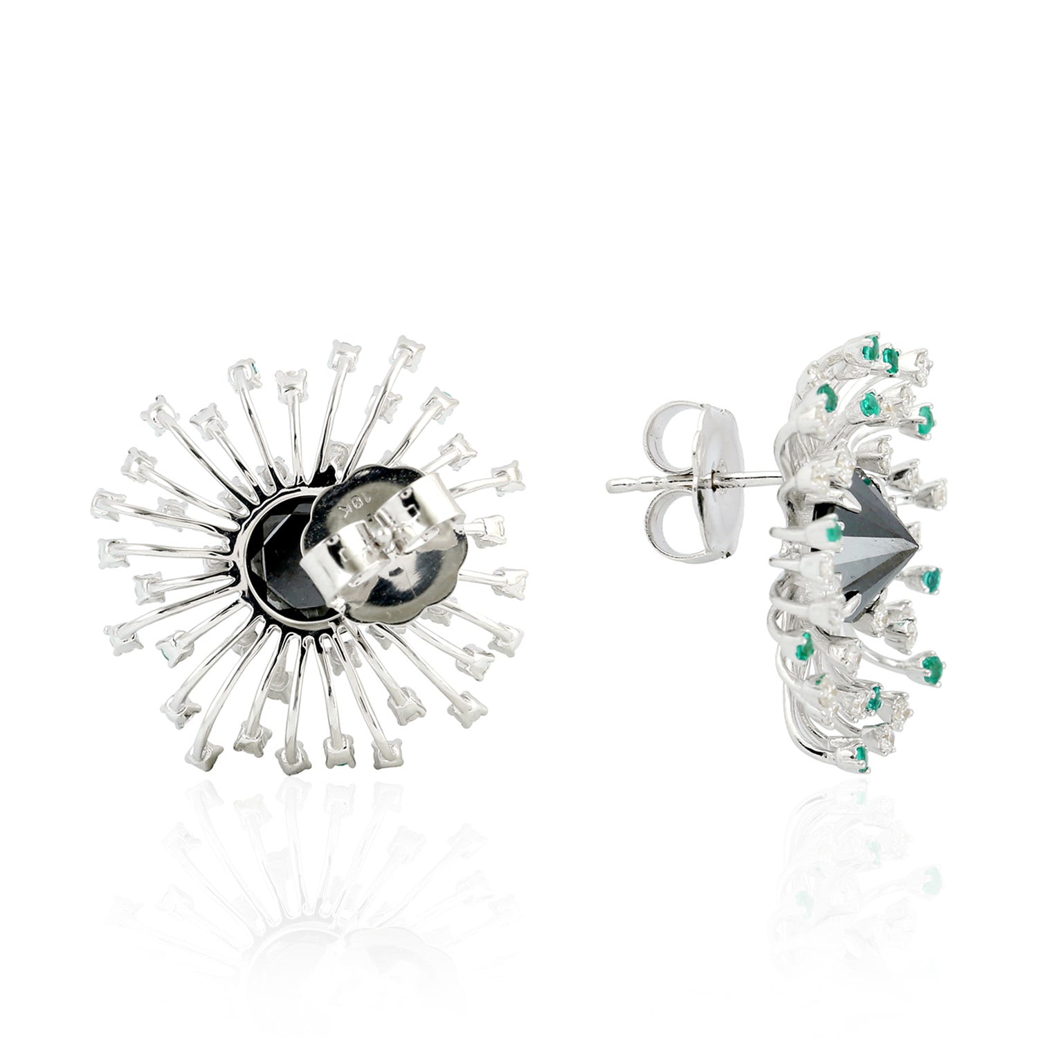 Black White Diamond Emerald Gemstone Sun Burst Stud Earrings In White Gold