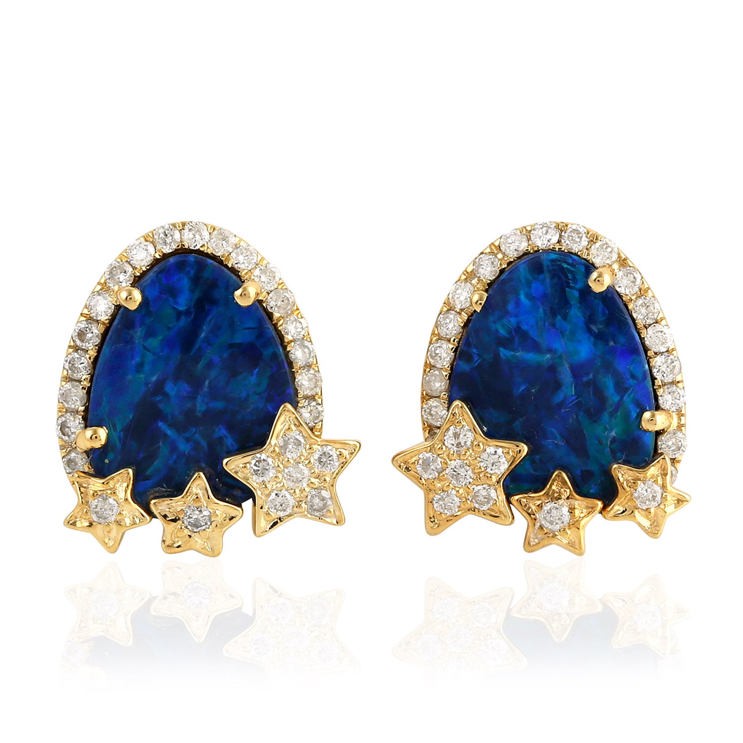 • Opal Doublet Pave Diamond Star Stud Earrings In 18k Yellow Gold