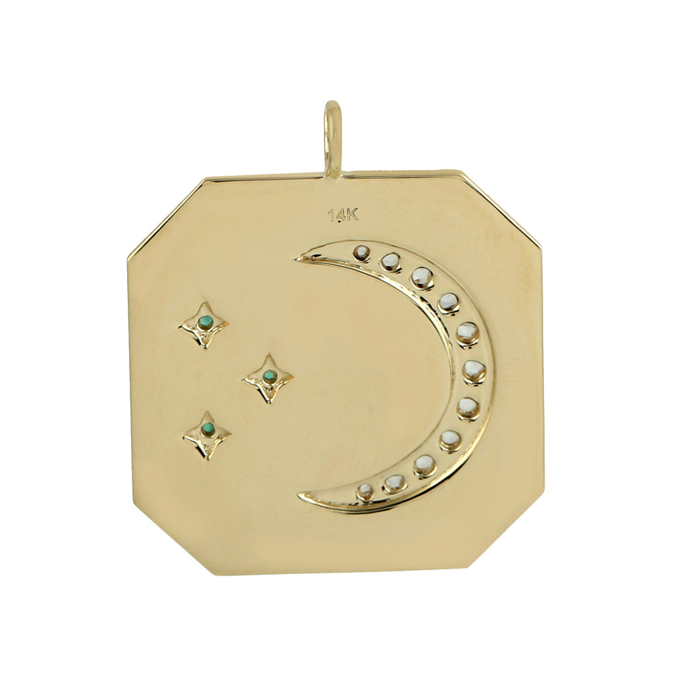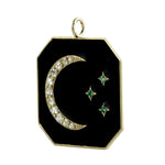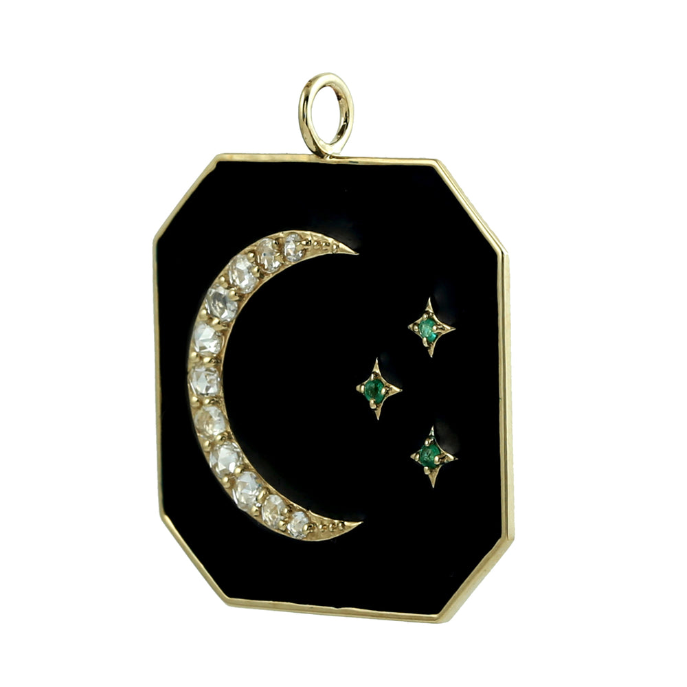 Emerald Pave Diamond Enamel Crescent Moon Star In 14k Yellow Gold Pendant