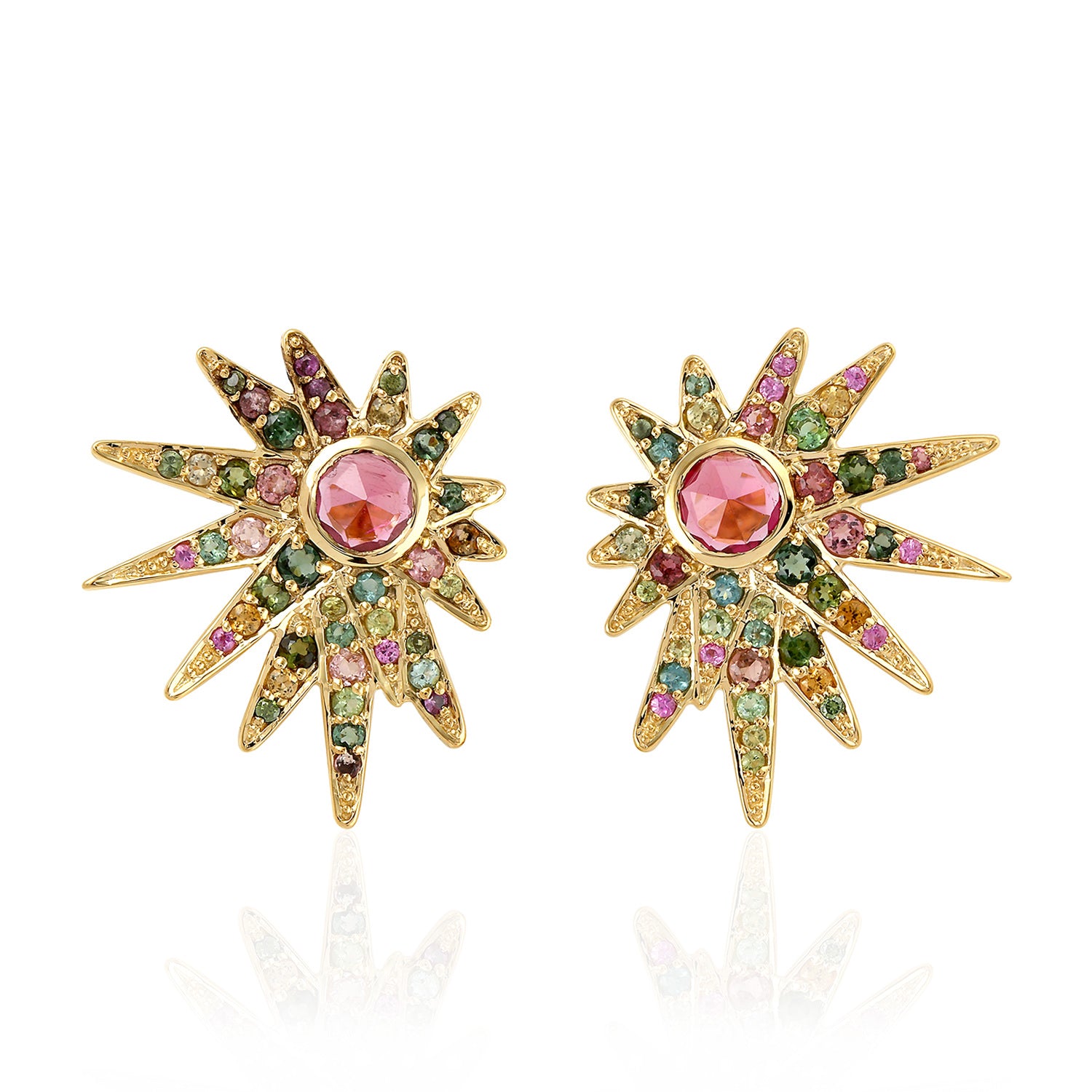 Pink Tourmaline Pave Multi Sapphire Starburst Stud Earrings In 18K Yellow Gold