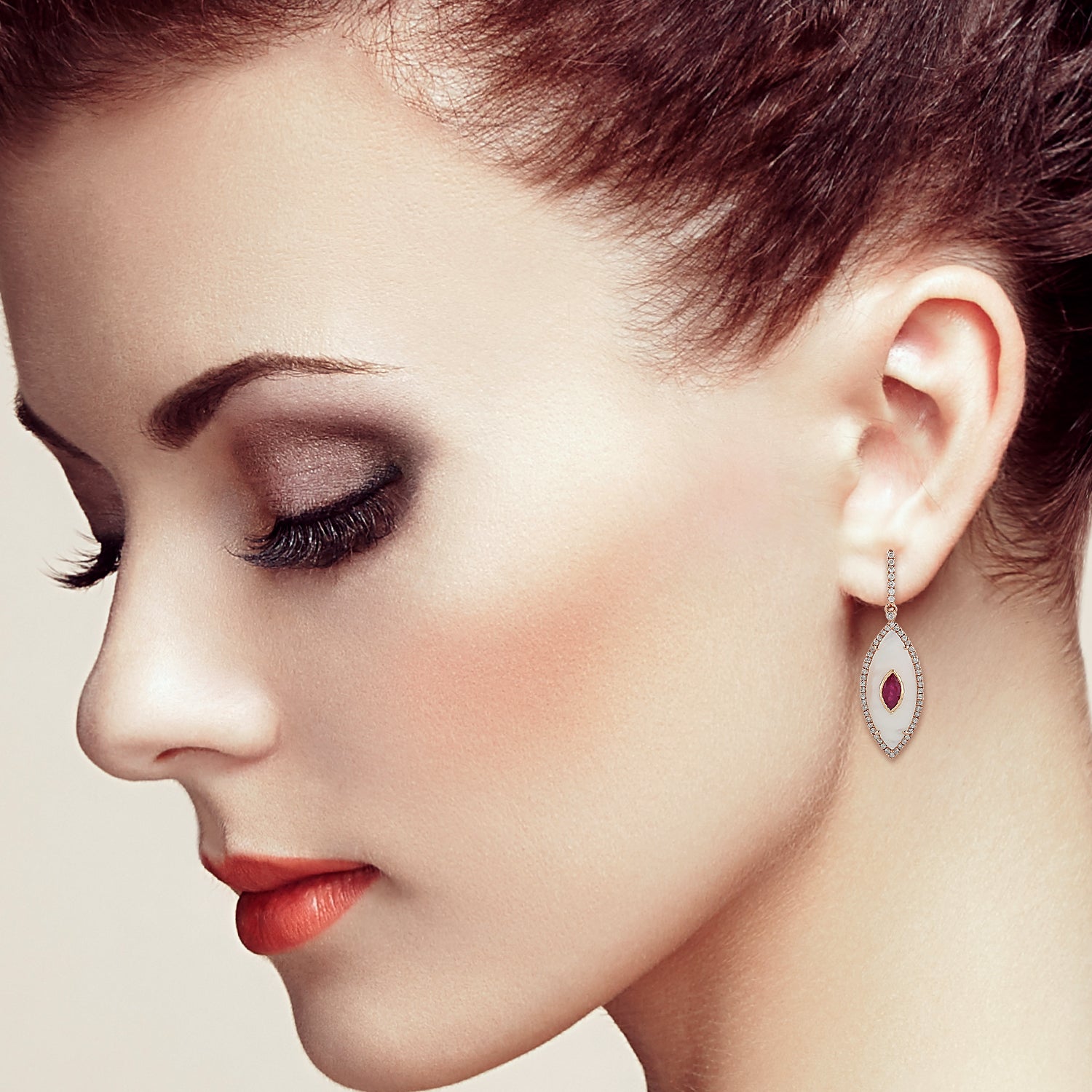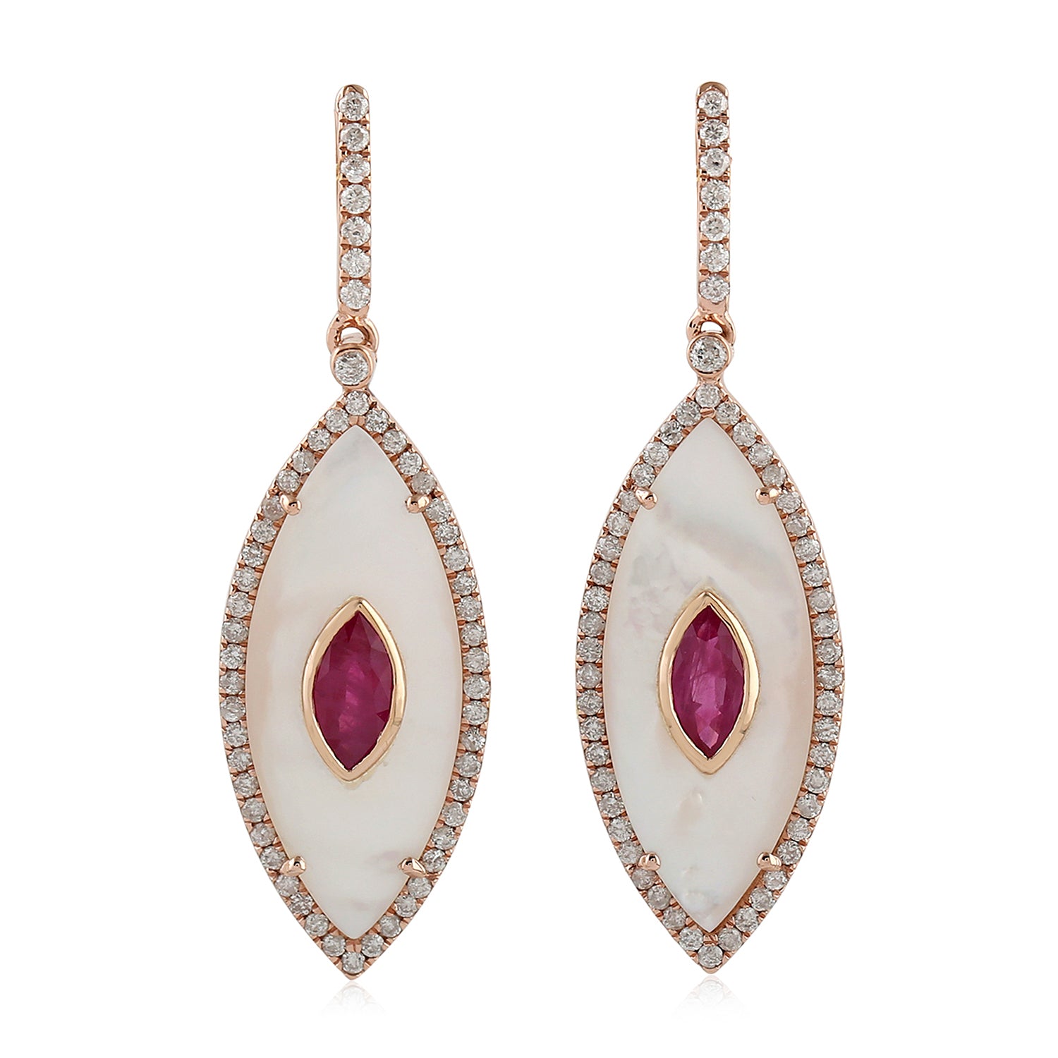 18K Rose Gold Bezel Ruby Marquise Cut MOP Pave Diamond Evil Eye Earrings