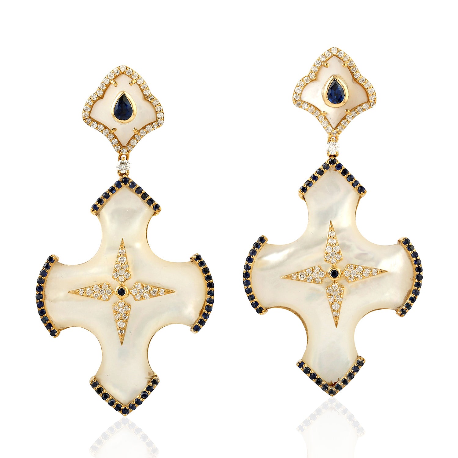 MOP Blue Sapphire Gemstone Pave Diamond Cross Danglers In Gold