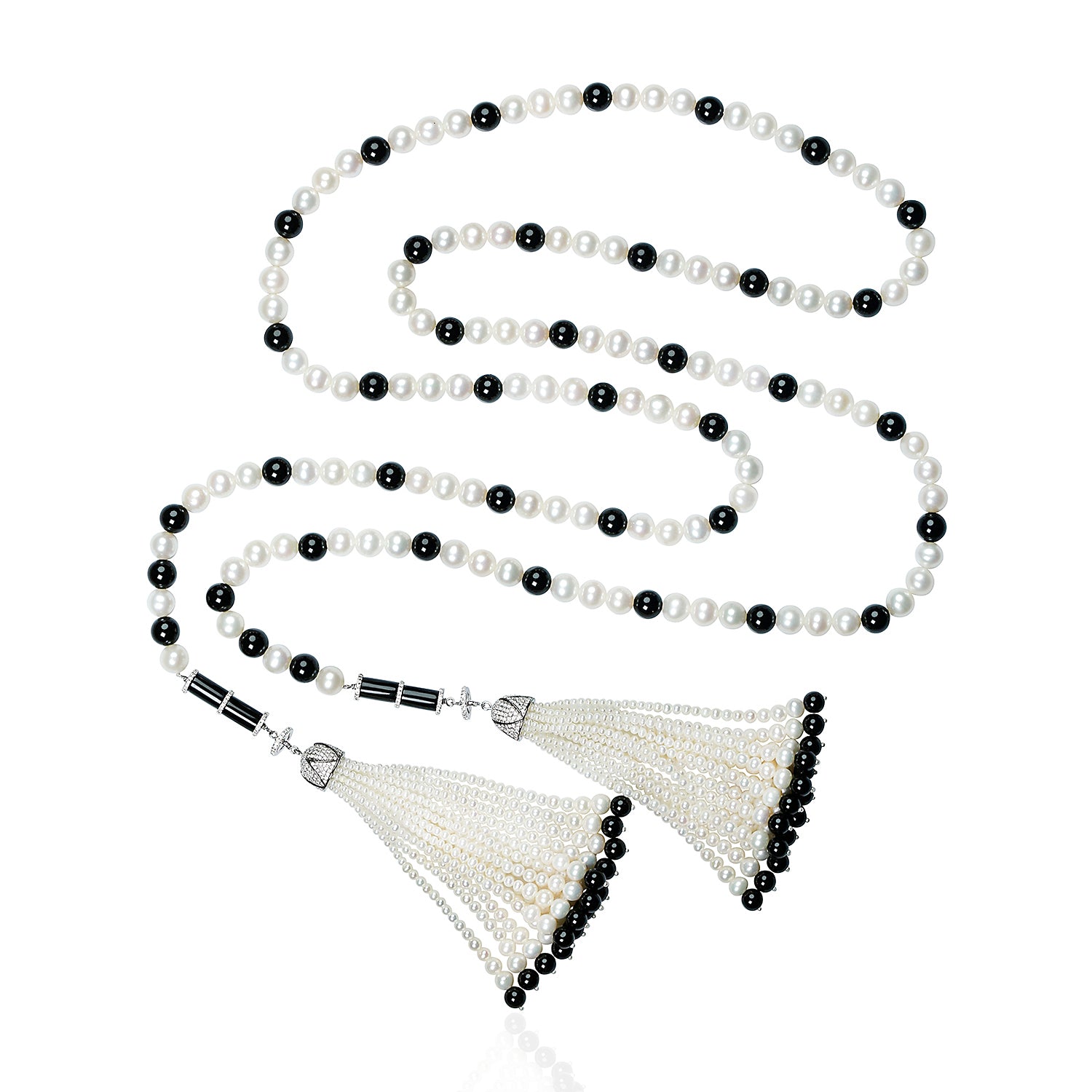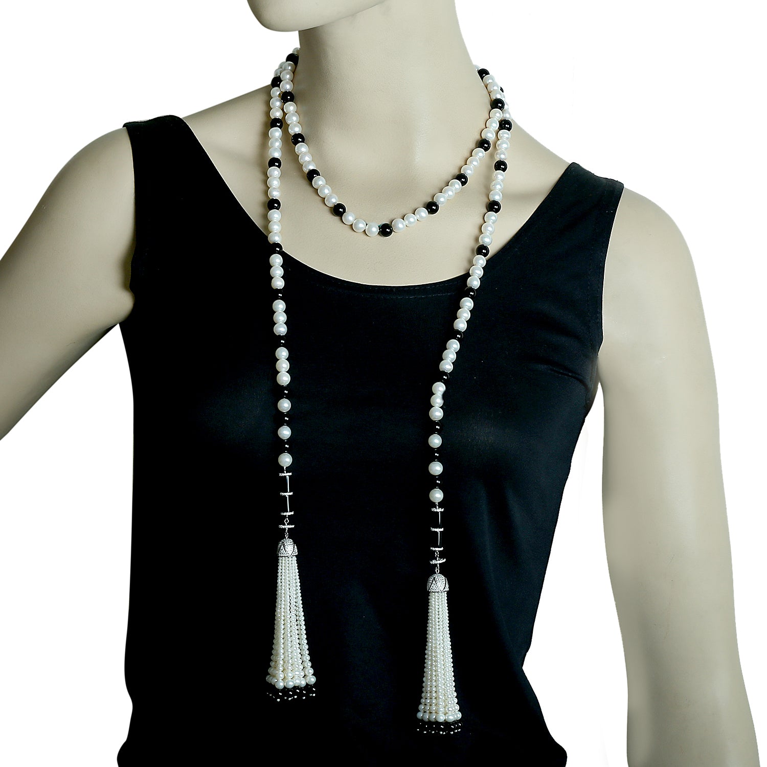 Pearl, Chinese Onyx & Pave Diamond Beads Tassel Rope Necklace in White Gold