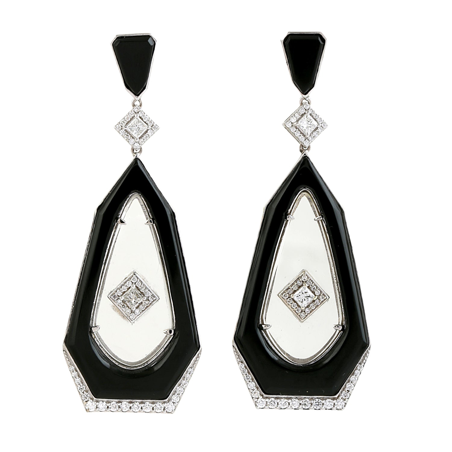 Black Onyx, Crystal & Diamond Art Deco Drop Earrings in 18K White Gold