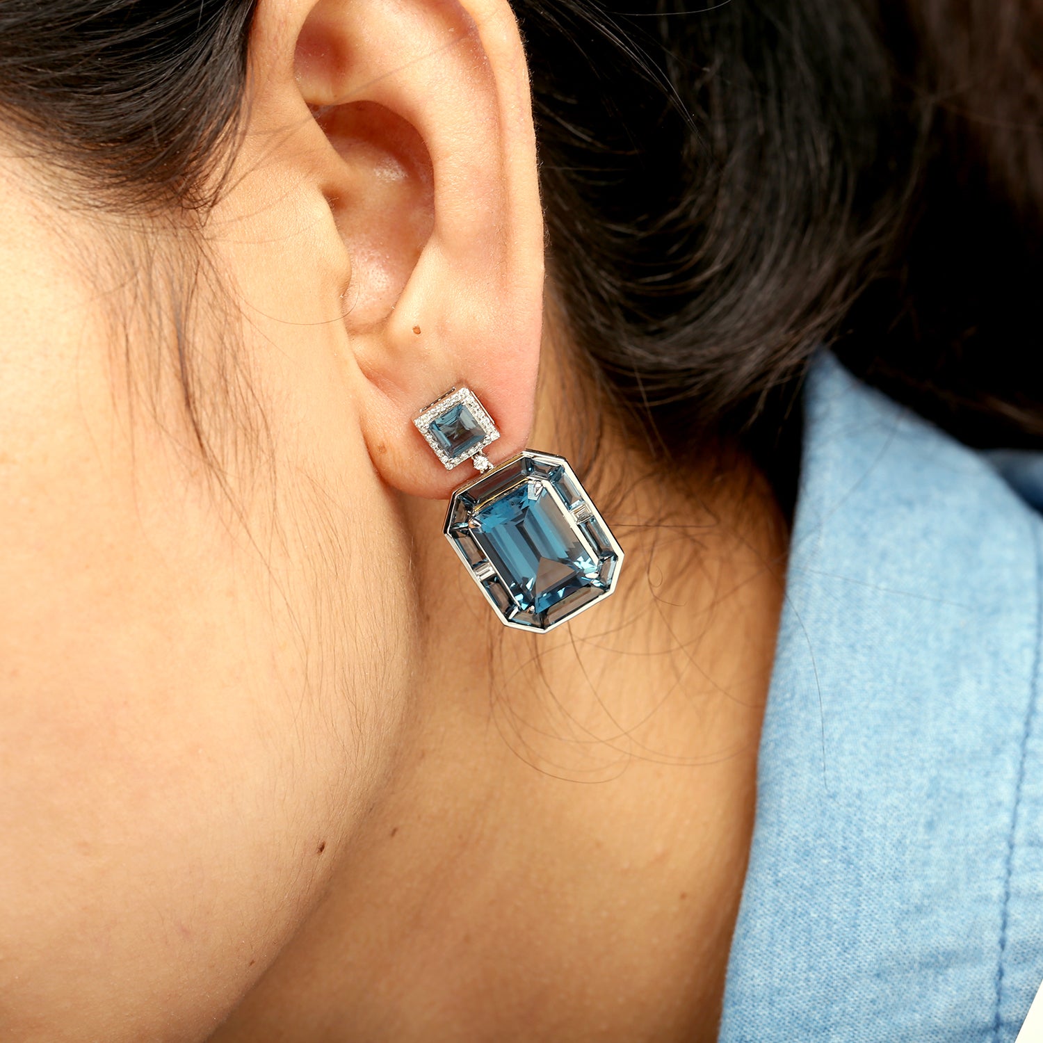 Octagon Cut London Blue Topaz Pave Diamond Designer Earrings in 18K White Gold