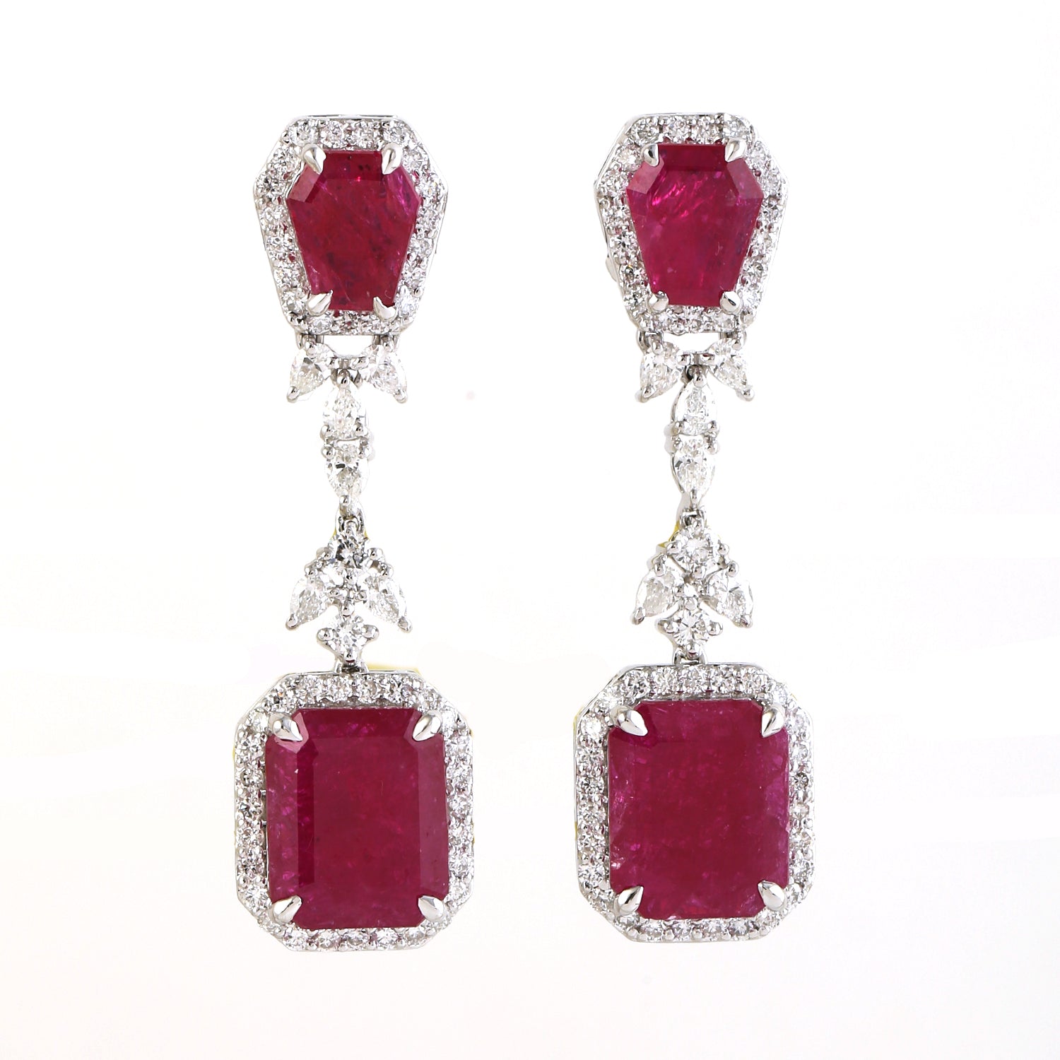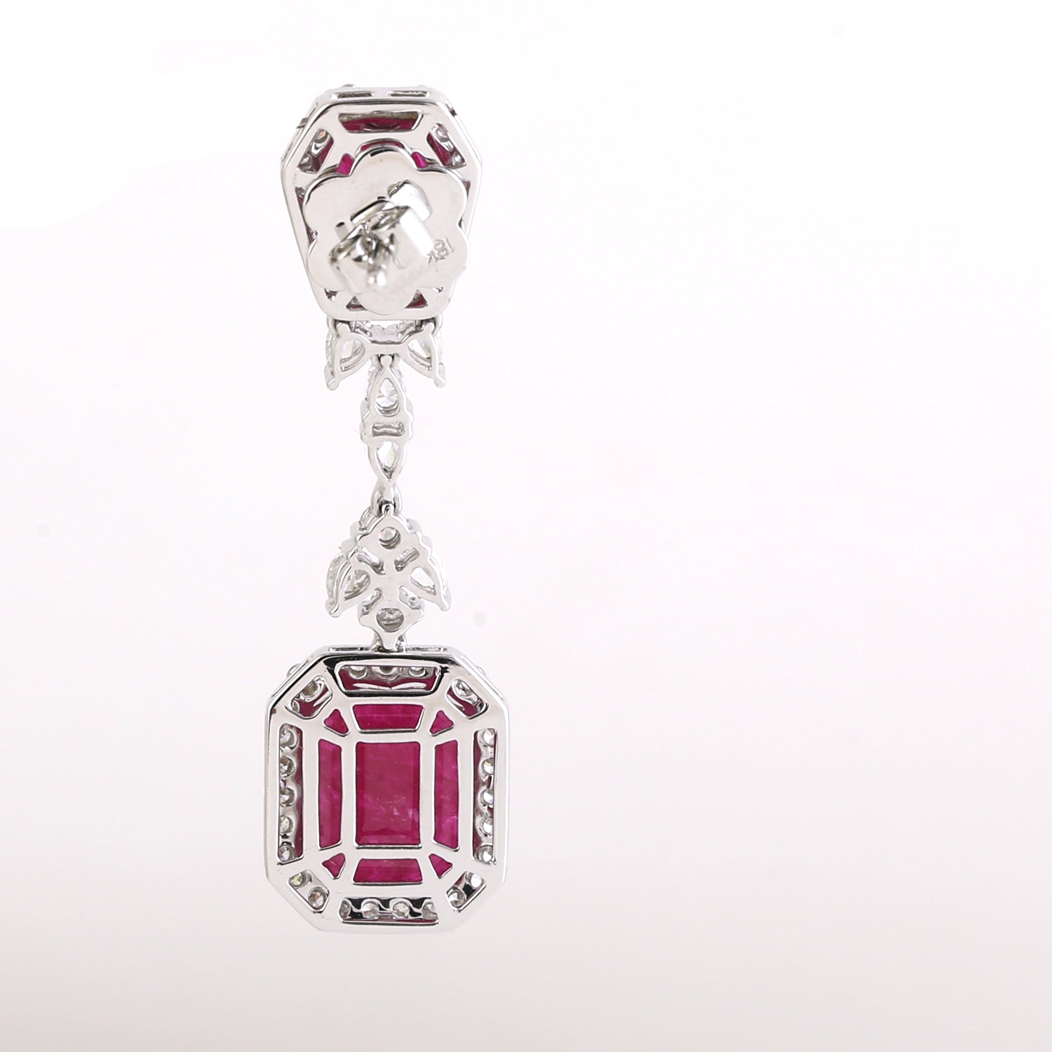 • Octagon Cut Ruby Prong Rose Cut Diamond Designer Dangler In Solid White Gold