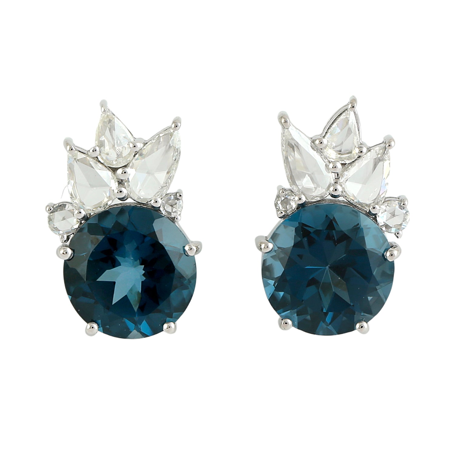 Round Cut London Topaz Rose Cut Diamond Unique Stud Earrings In 14K White Gold