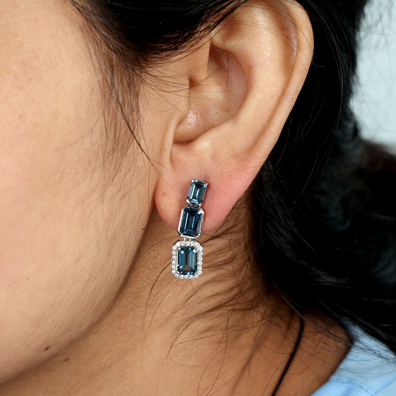 14K White Gold Prong Octagon Cut London Topaz Pave Diamond Classic Dangler