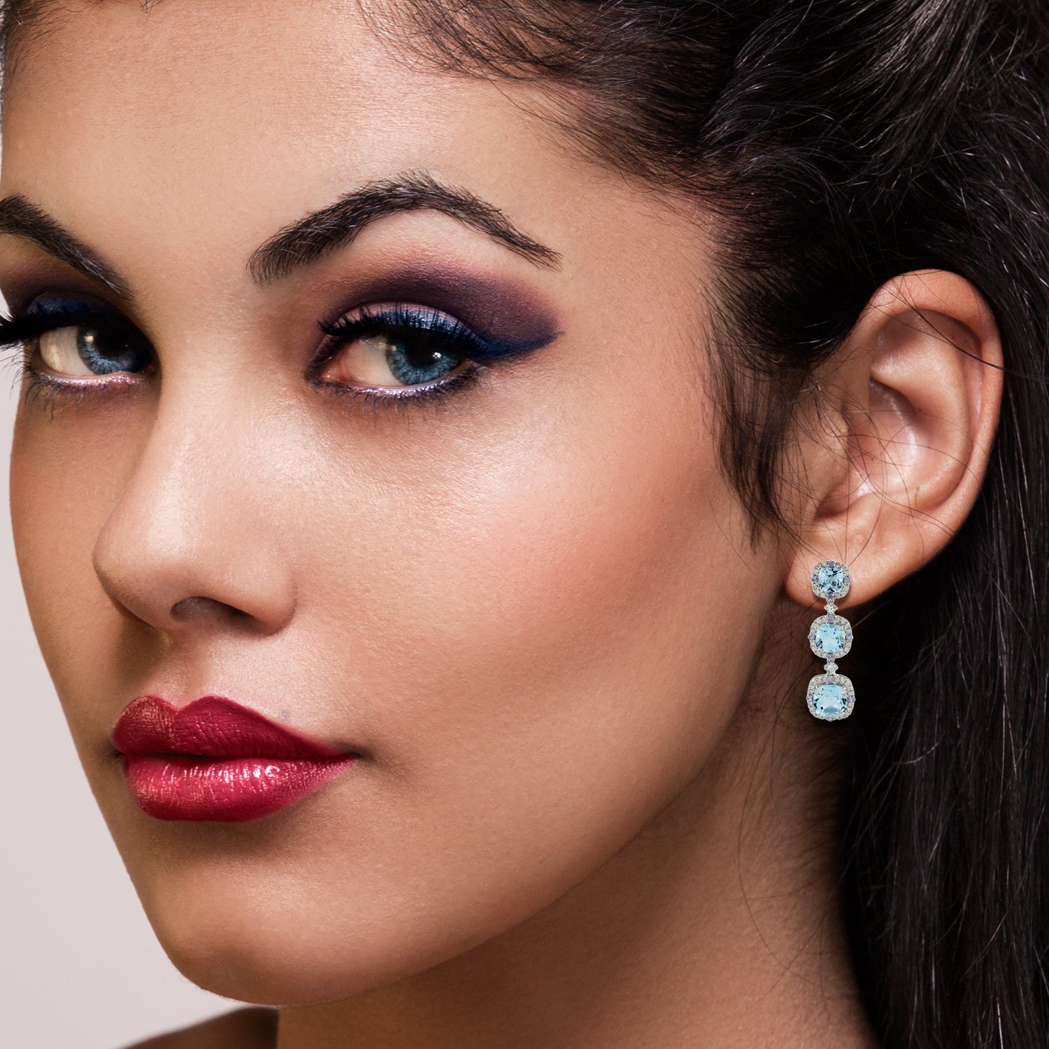 Cushion Blue Topaz Prong Tanzanite Sapphire Pave Diamond Dangler In White Gold