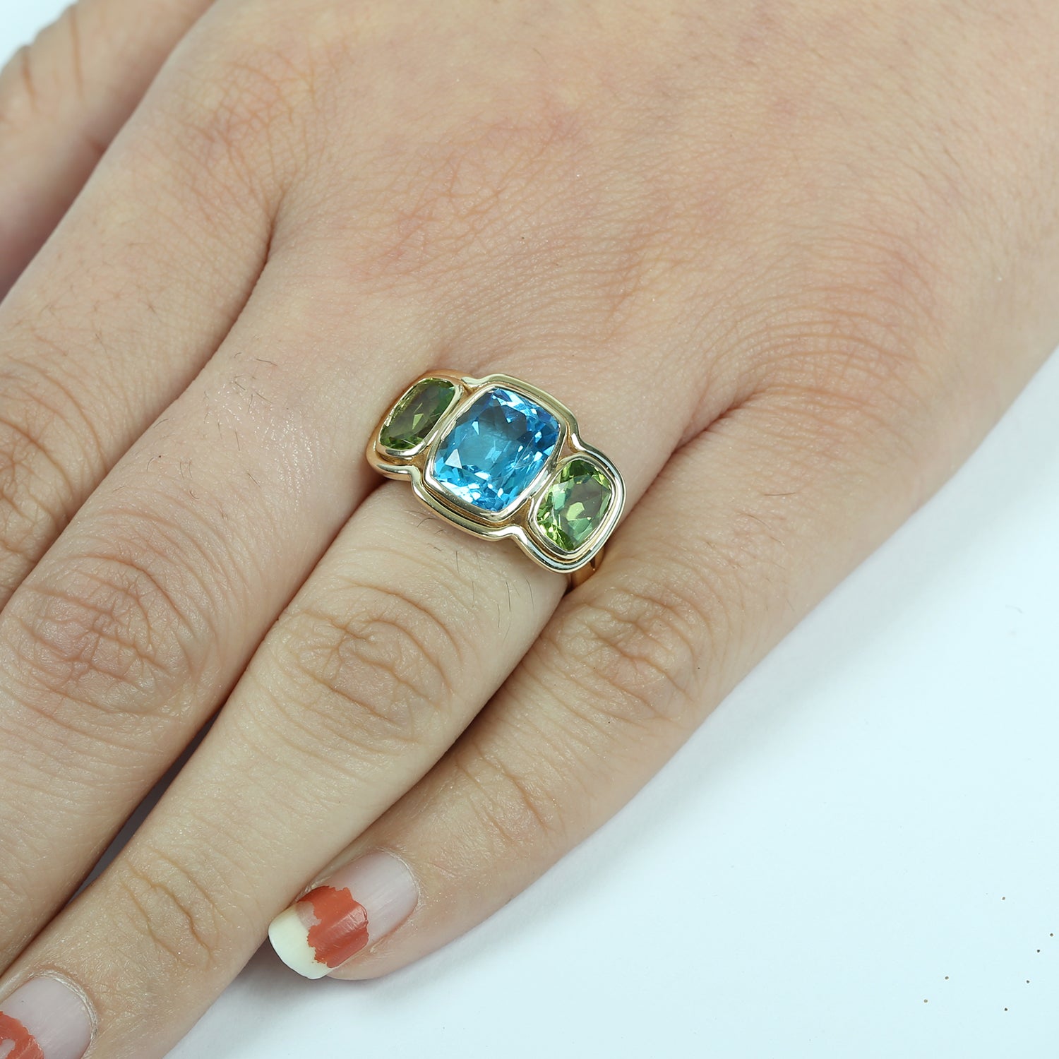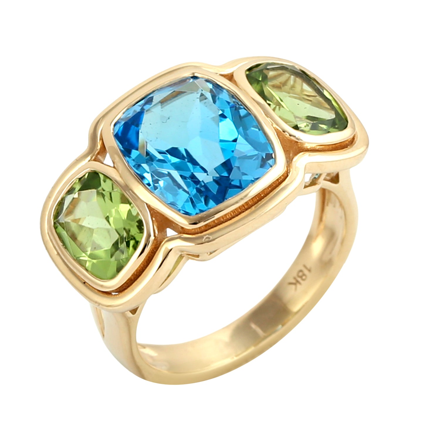 Cushion Cut Topaz And Peridot Gemstone Three Stone Ring In 18K Yellow Gold