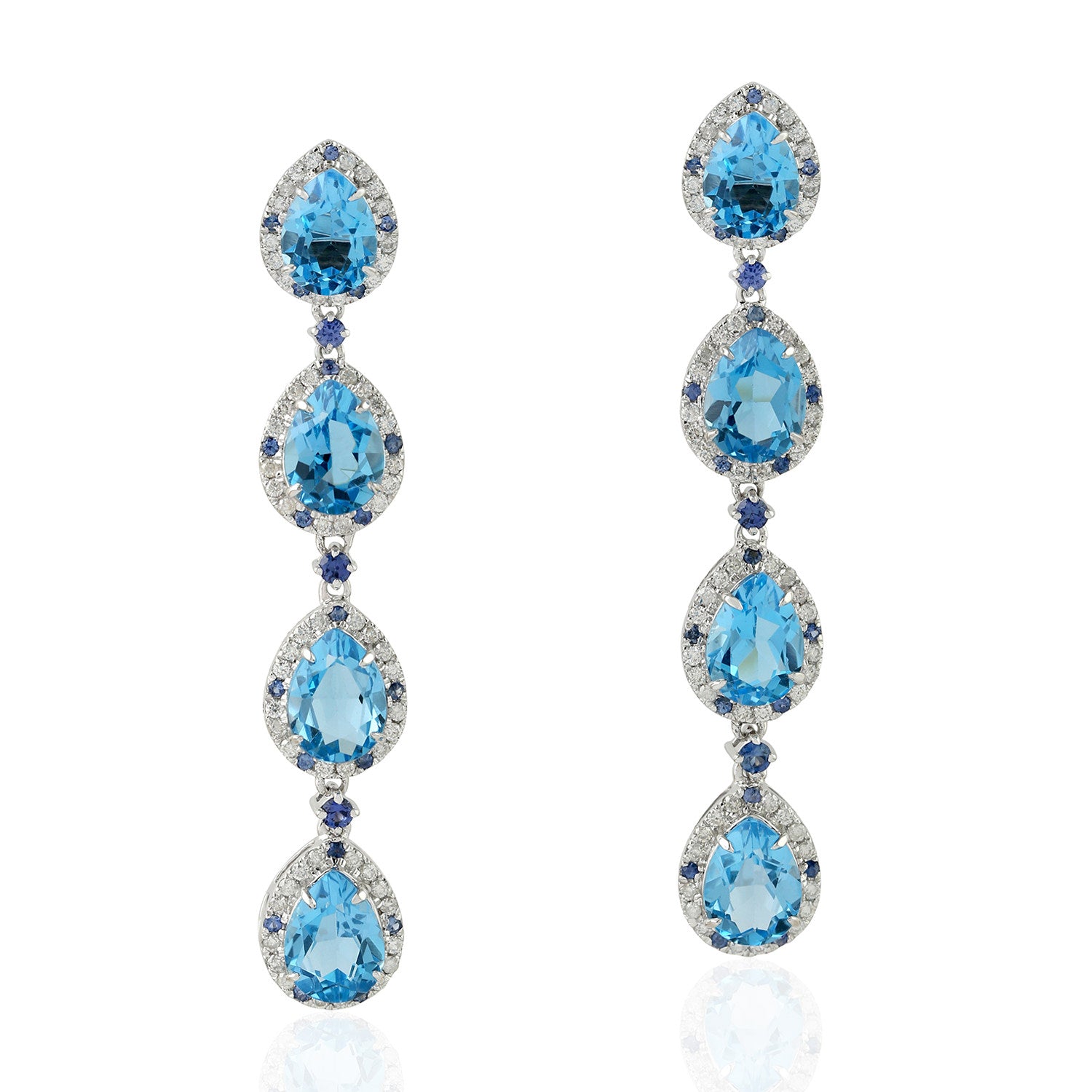 Pear Cut Blue Topaz Prong Blue Sapphire Pave Diamond Drop Dangler In White Gold