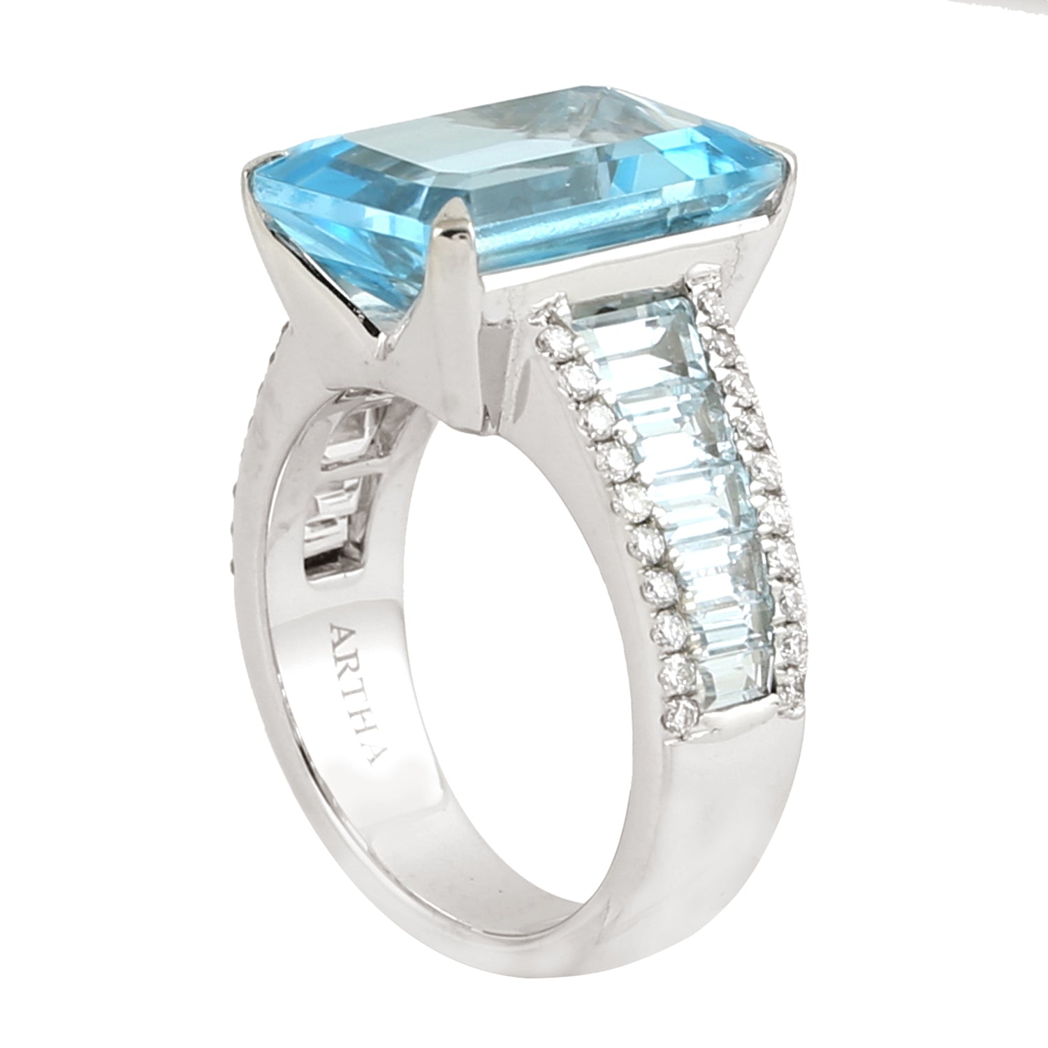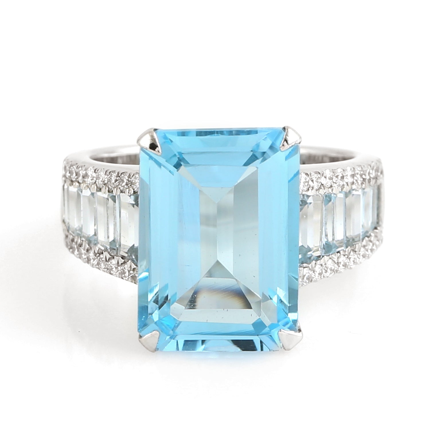 Rhombus Cut Blue Topaz Pave Diamond Solitaire Ring In In 18K White Gold