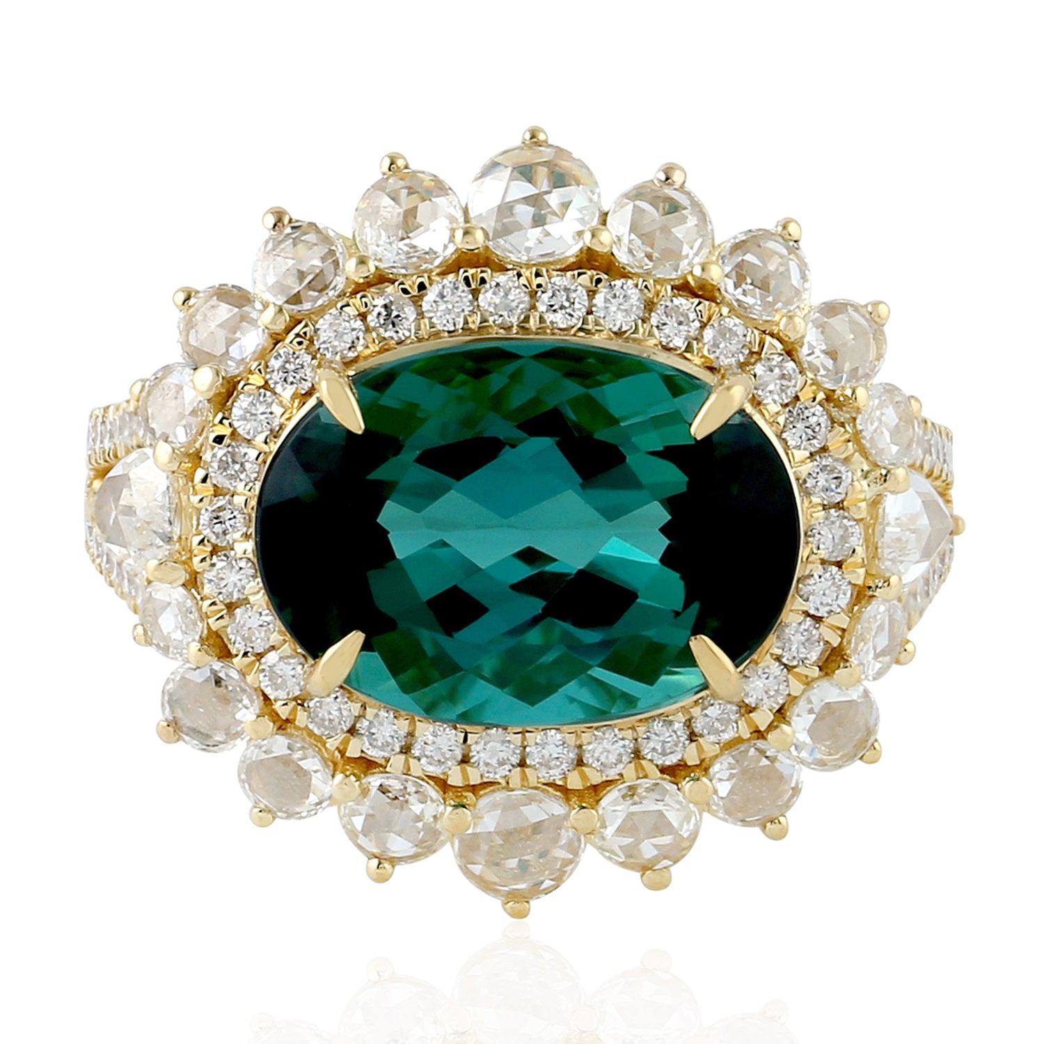 Oval Cut Green Tourmaline Rose Cut Diamond In 18k Yellow Gold Beautiful Ring