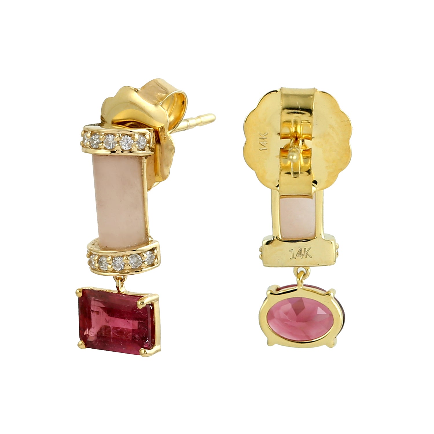 Pink Tourmaline & Opal Gemstone Pave Diamond Danglers In 14k Yellow Gold