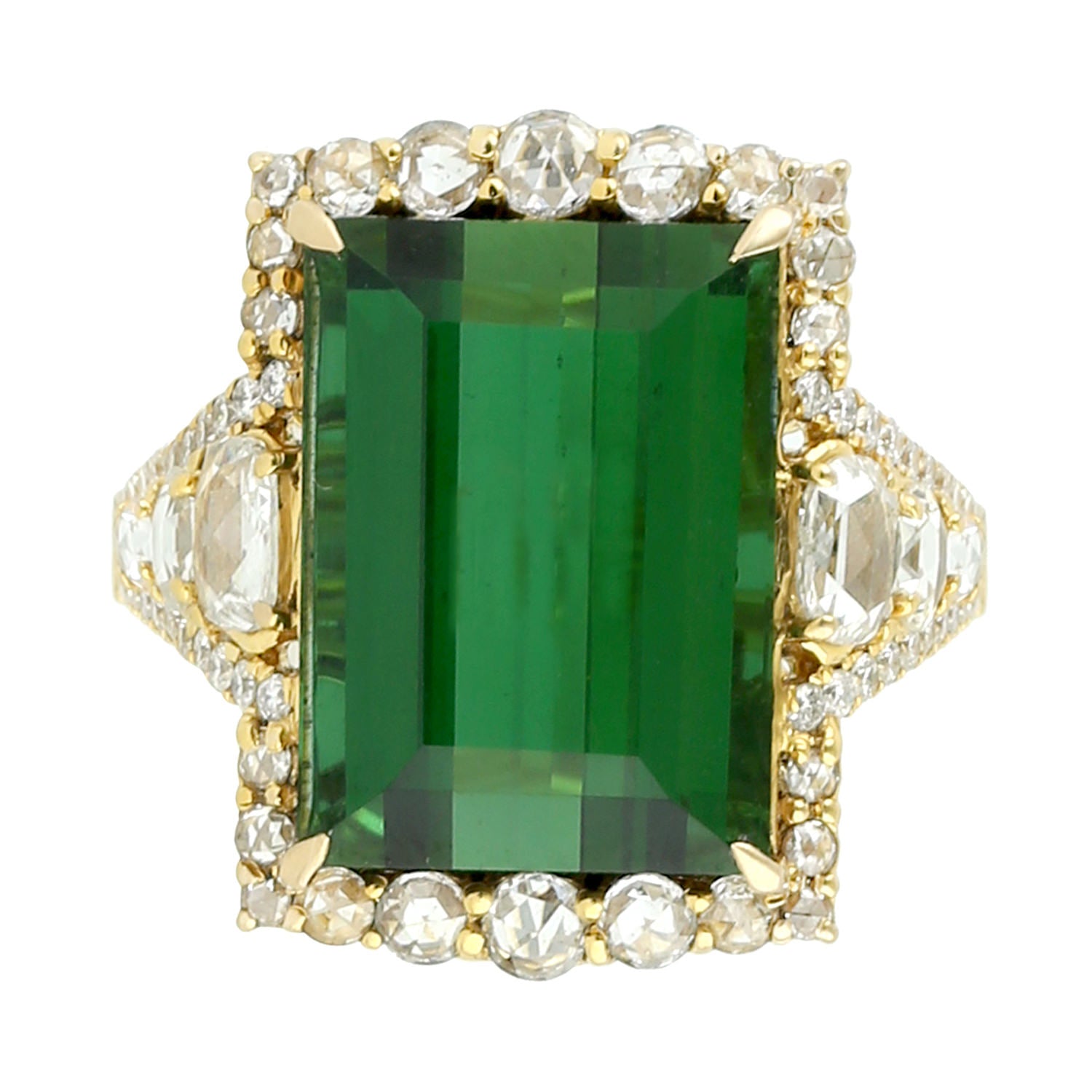 Green Tourmaline Gemstone Prong Uncut Diamond Cocktail Ring In 18k Yellow Gold