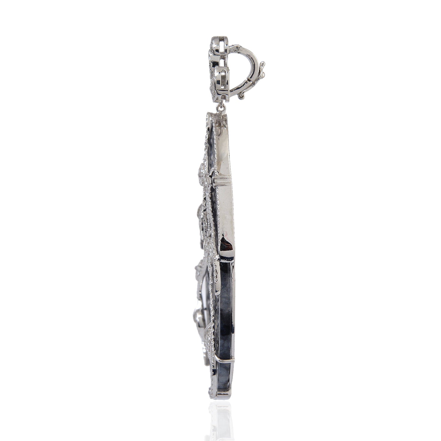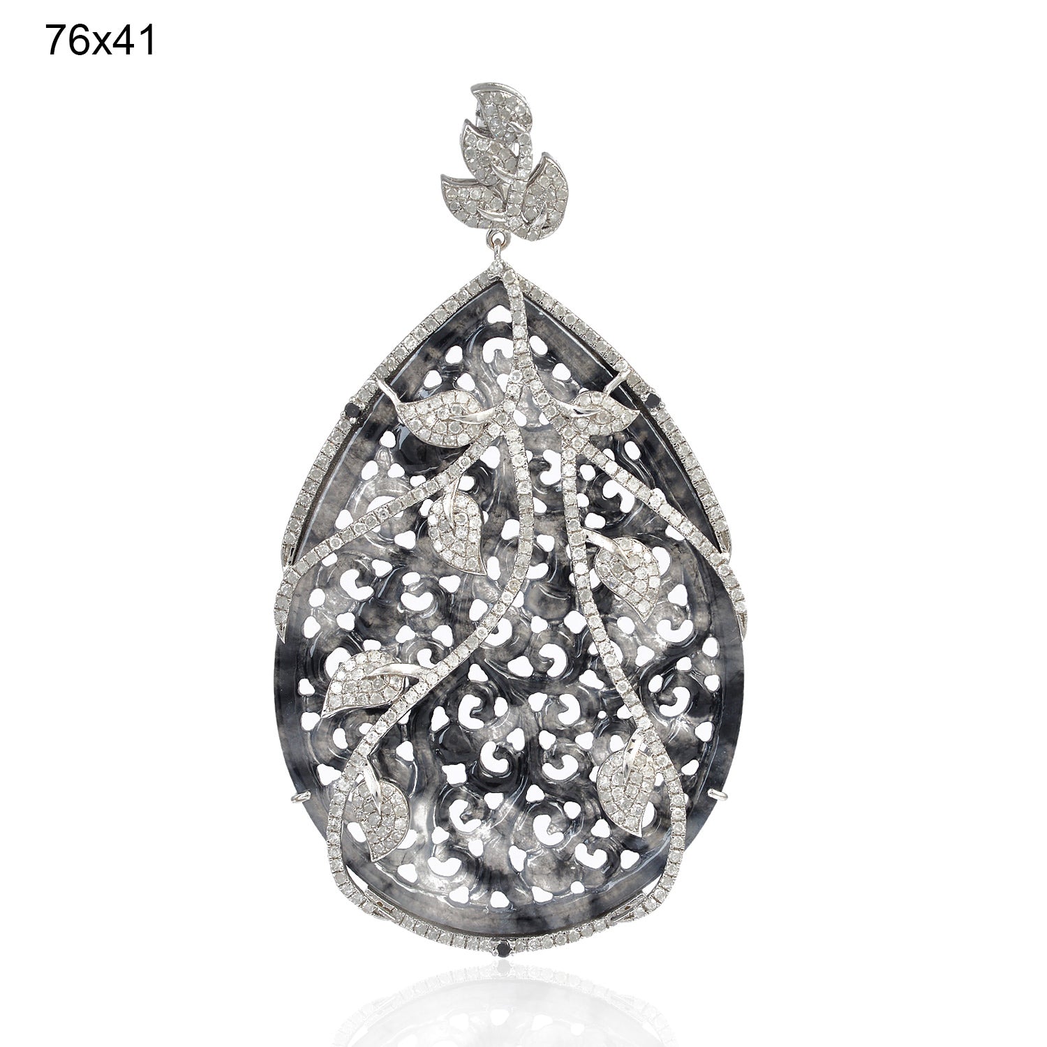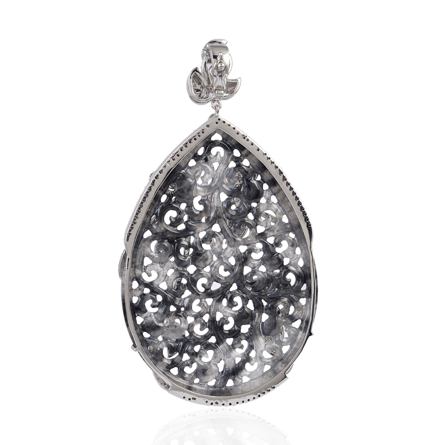 Carved Grey Jade & Diamond Filigree Statement Pendant in 18K White Gold Silver