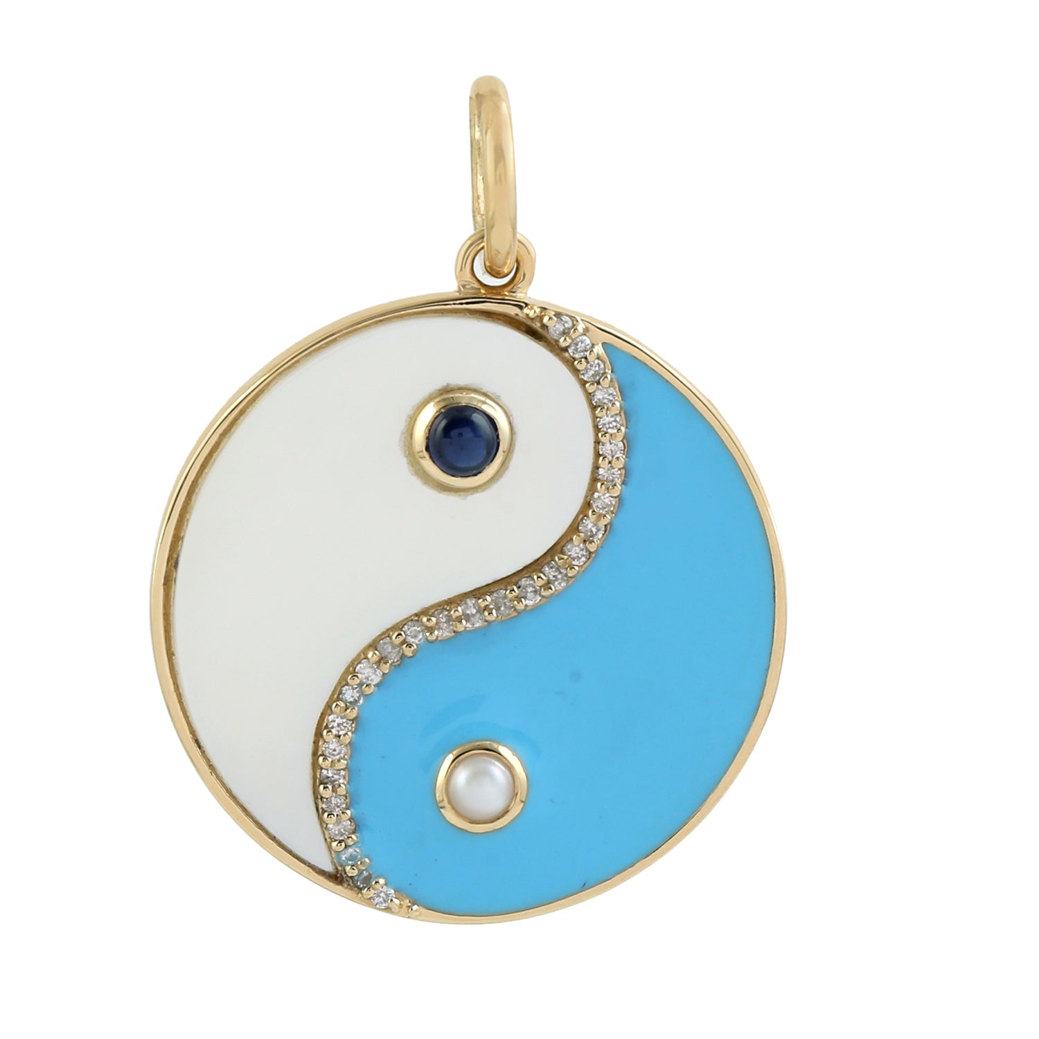 Fancy MOP Bezel Set Blue Sapphire Pave Diamond Yin Yang Pendant In 18K Yellow Gold
