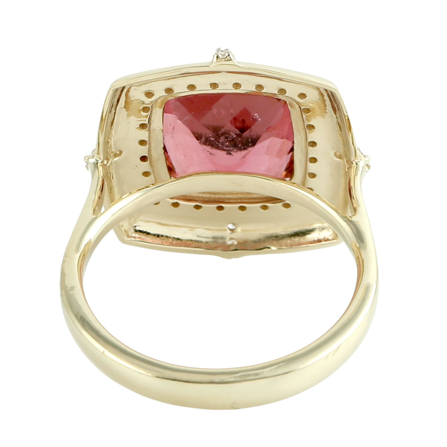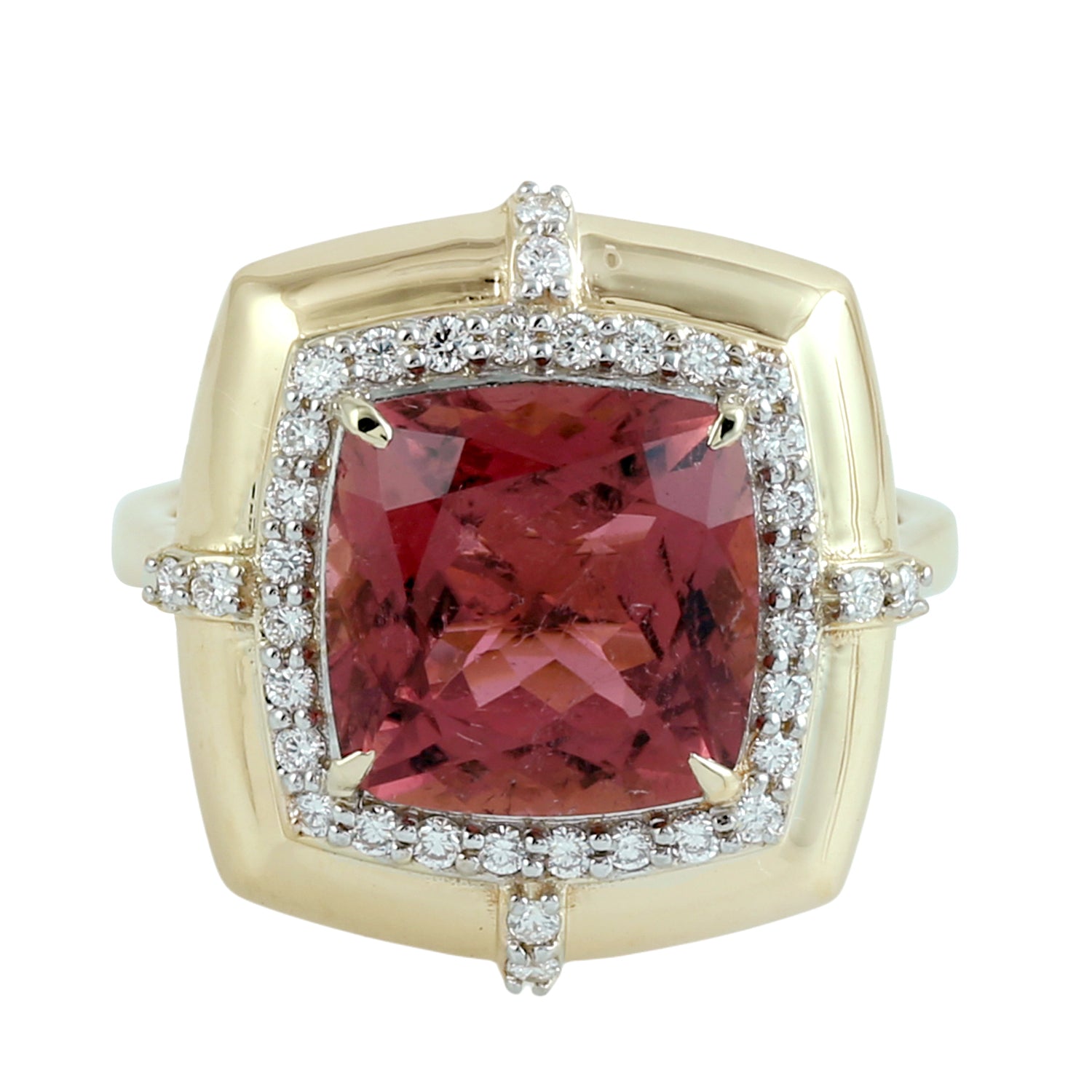 Cushion Cut Pink Tourmaline Pave Diamond Solitaire Ring in 14K Yellow Gold