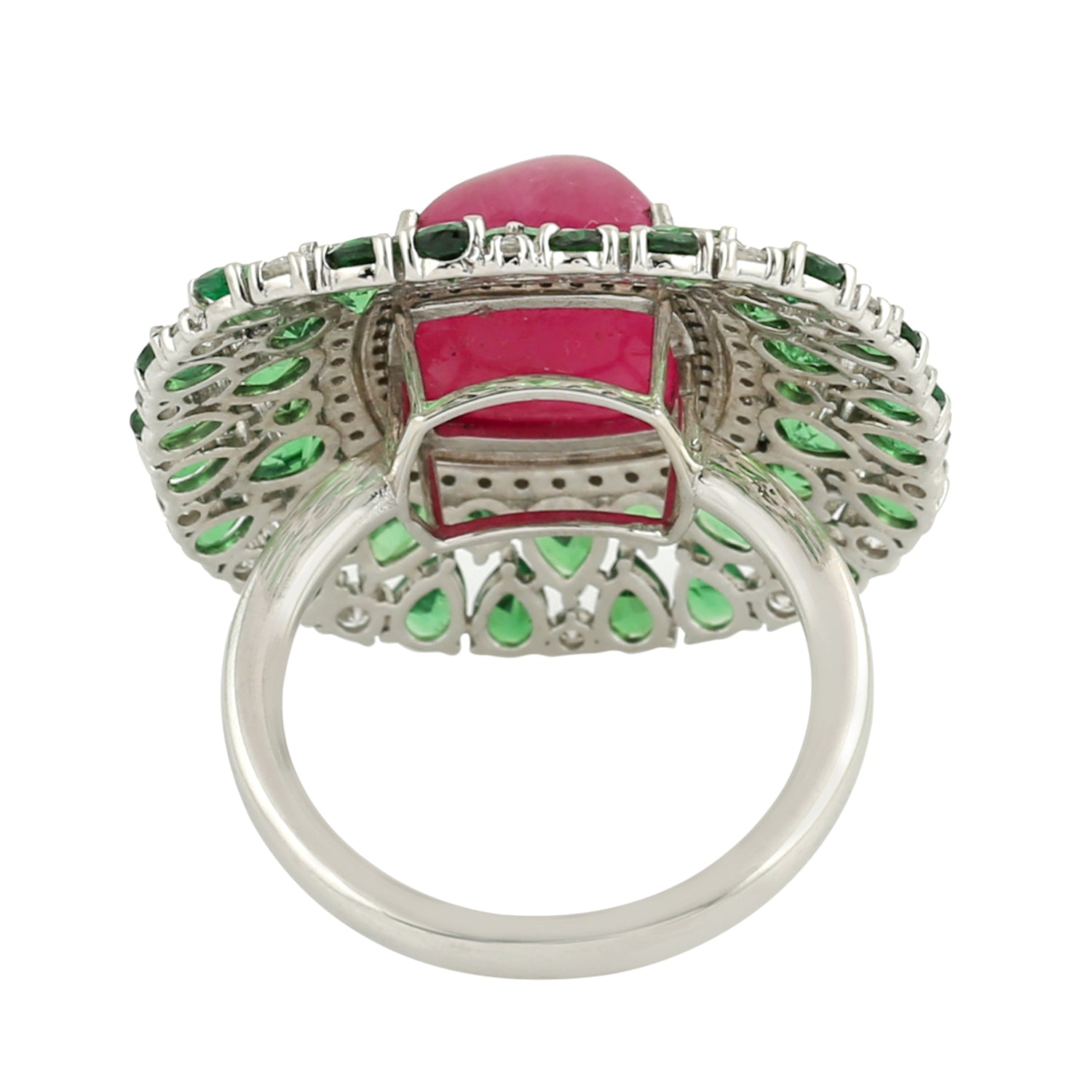Cushion Ruby, Tsavorite & Diamond Cocktail Ring in 18K White Gold