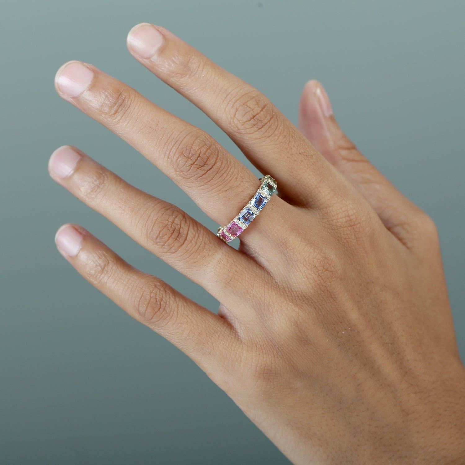 Multicolor Sapphire Gemstone Pave Diamond Eternity Ring in 14K Yellow Gold