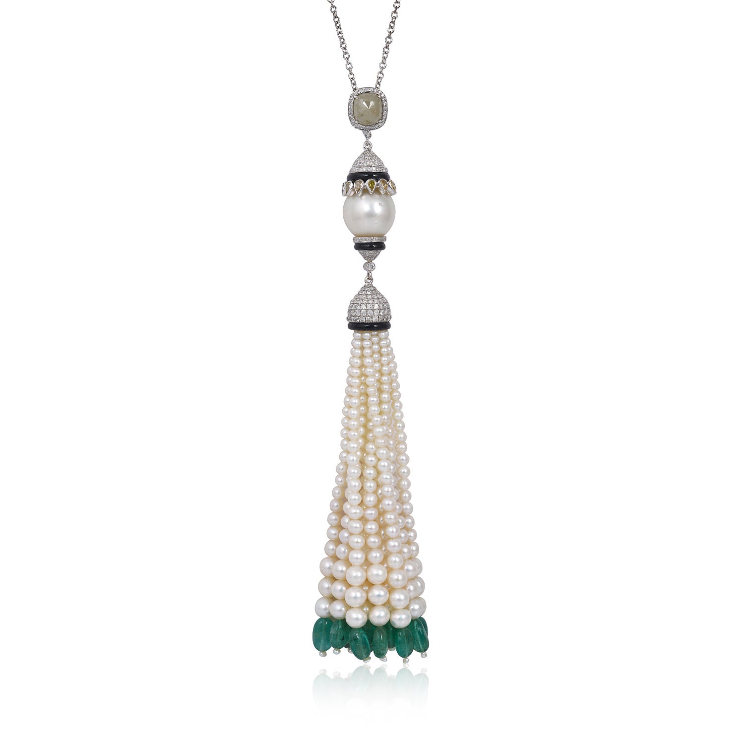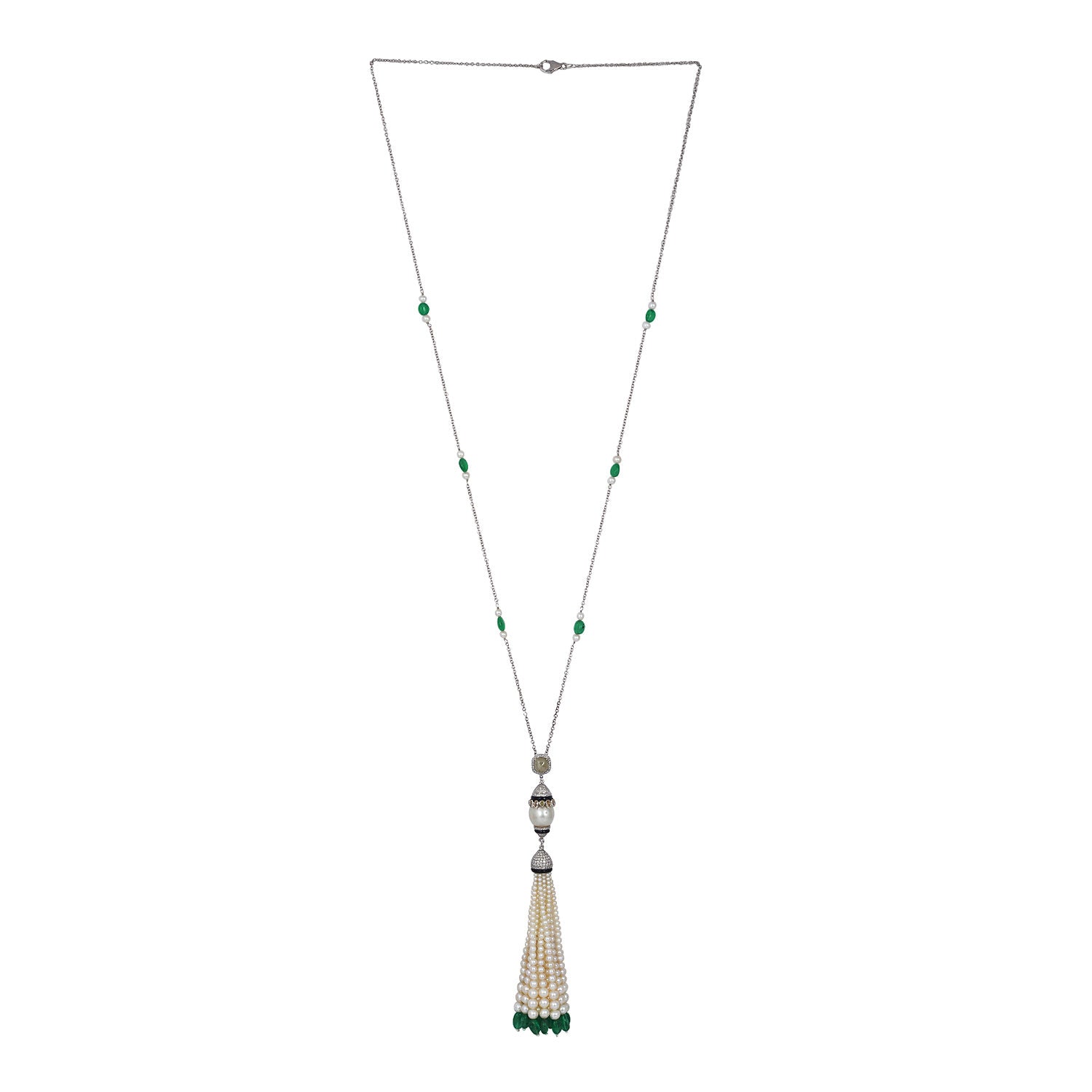 Pearl Beads Emerald Multi Gemstone Tassel Matinee Necklace Pave Diamond In White Gold