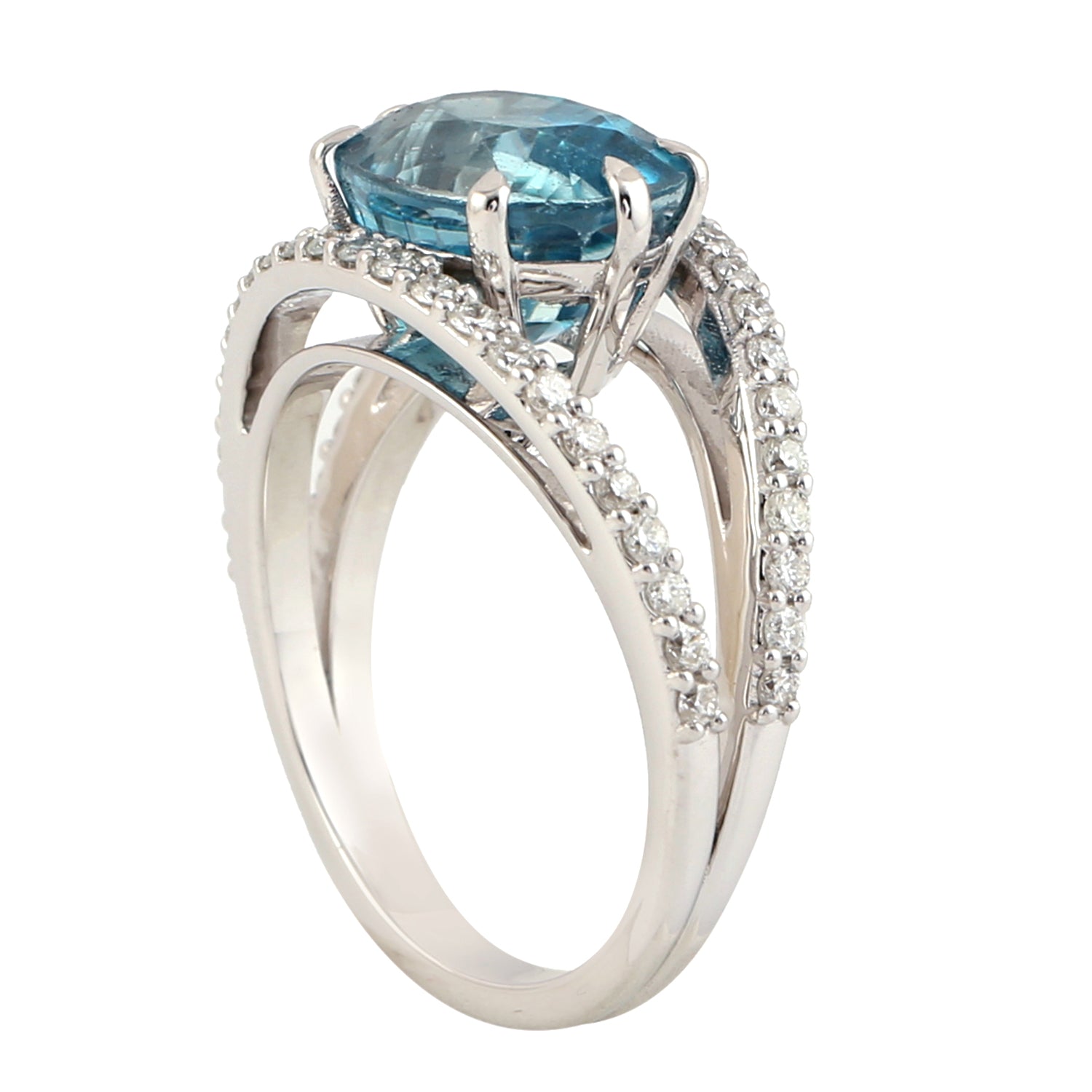 Oval Cut Blue Zircon Solitaire Ring in 18K White Gold with Pave Diamond Halo – Timeless Elegance