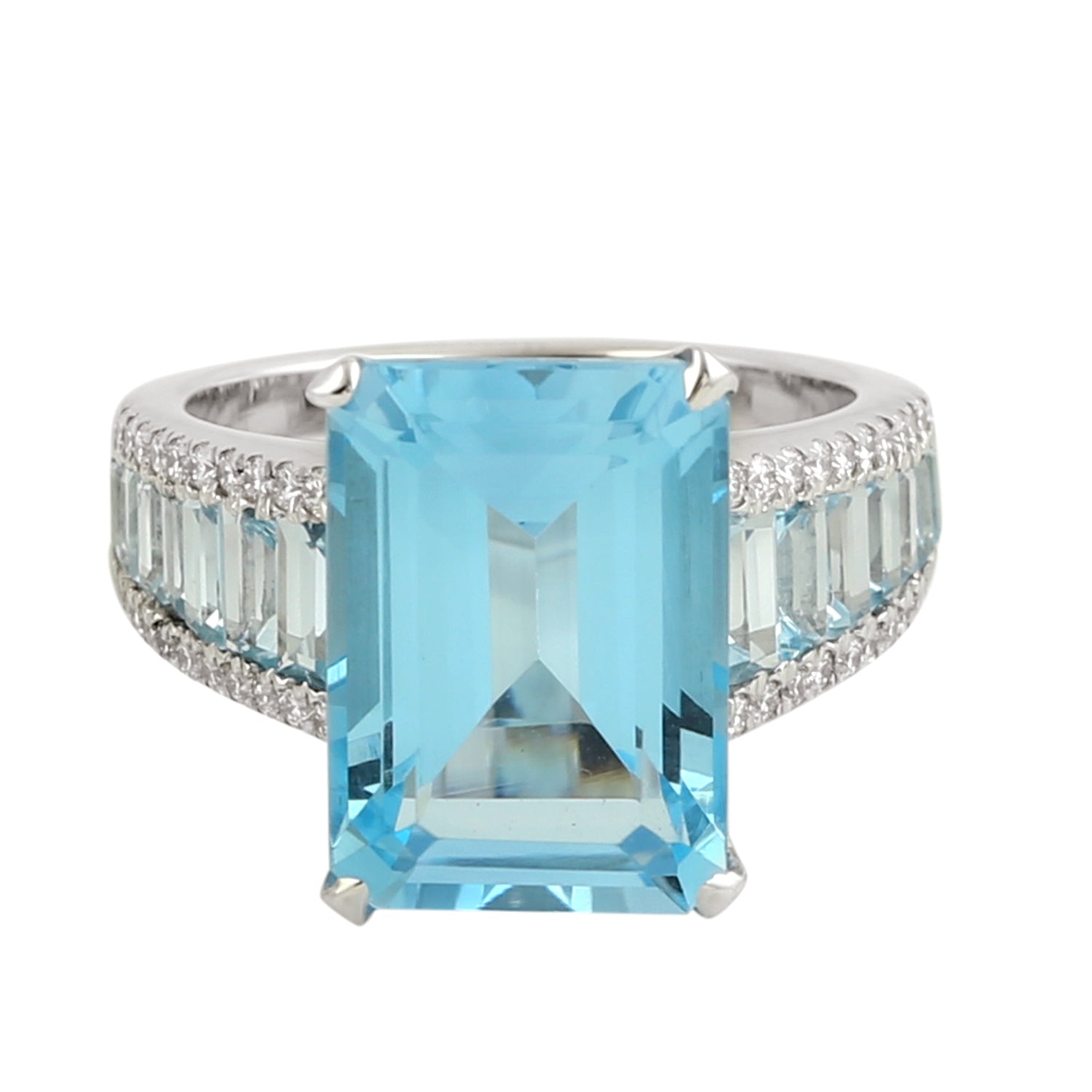 Emerald Cut Blue Topaz Pave Diamond In 18k White Gold Solitaire Ring For Women