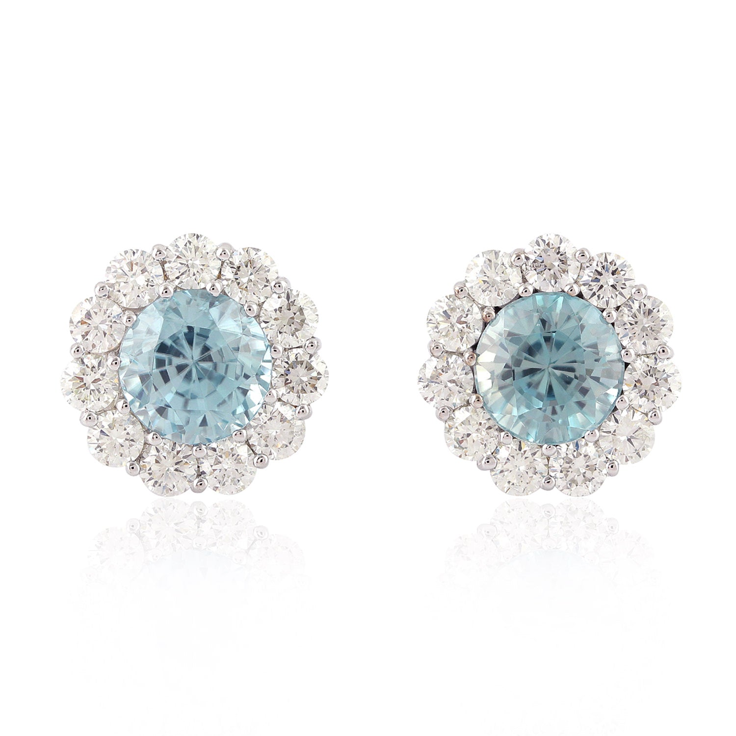 • Blue Zirconia & Diamond Floral Halo Stud Earrings in 18K White Gold