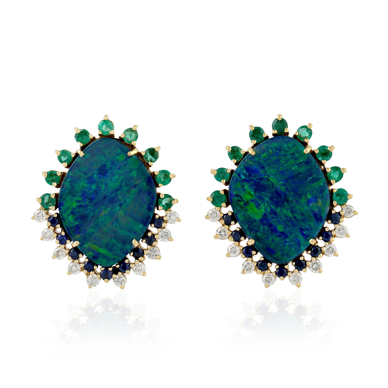 • Australian Opal, Emerald & Sapphire Pave Diamond Halo Stud Earrings in 18K Yellow Gold