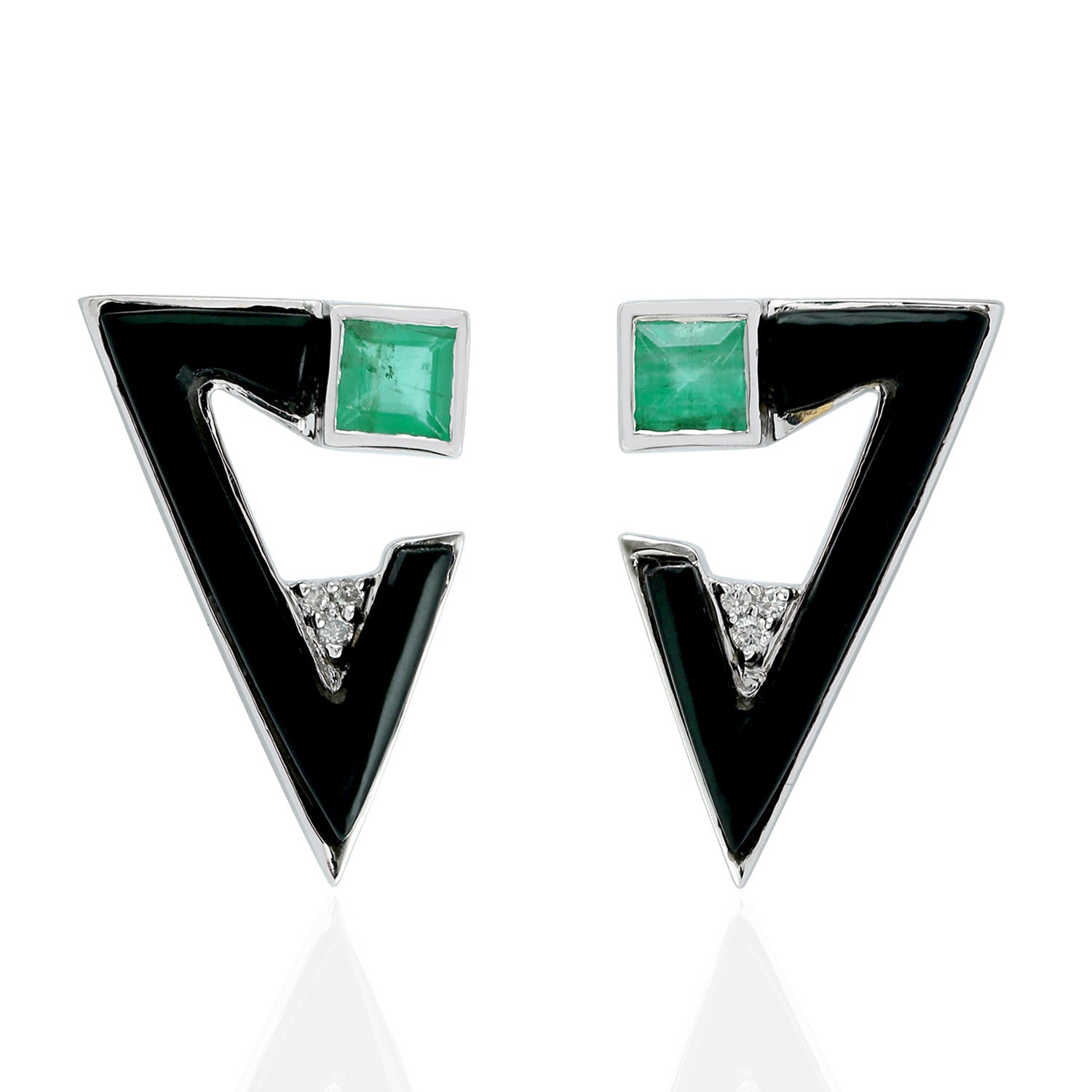 Emerald & Diamond Geometric V-Shape Enamel Stud Earrings in 18K White Gold