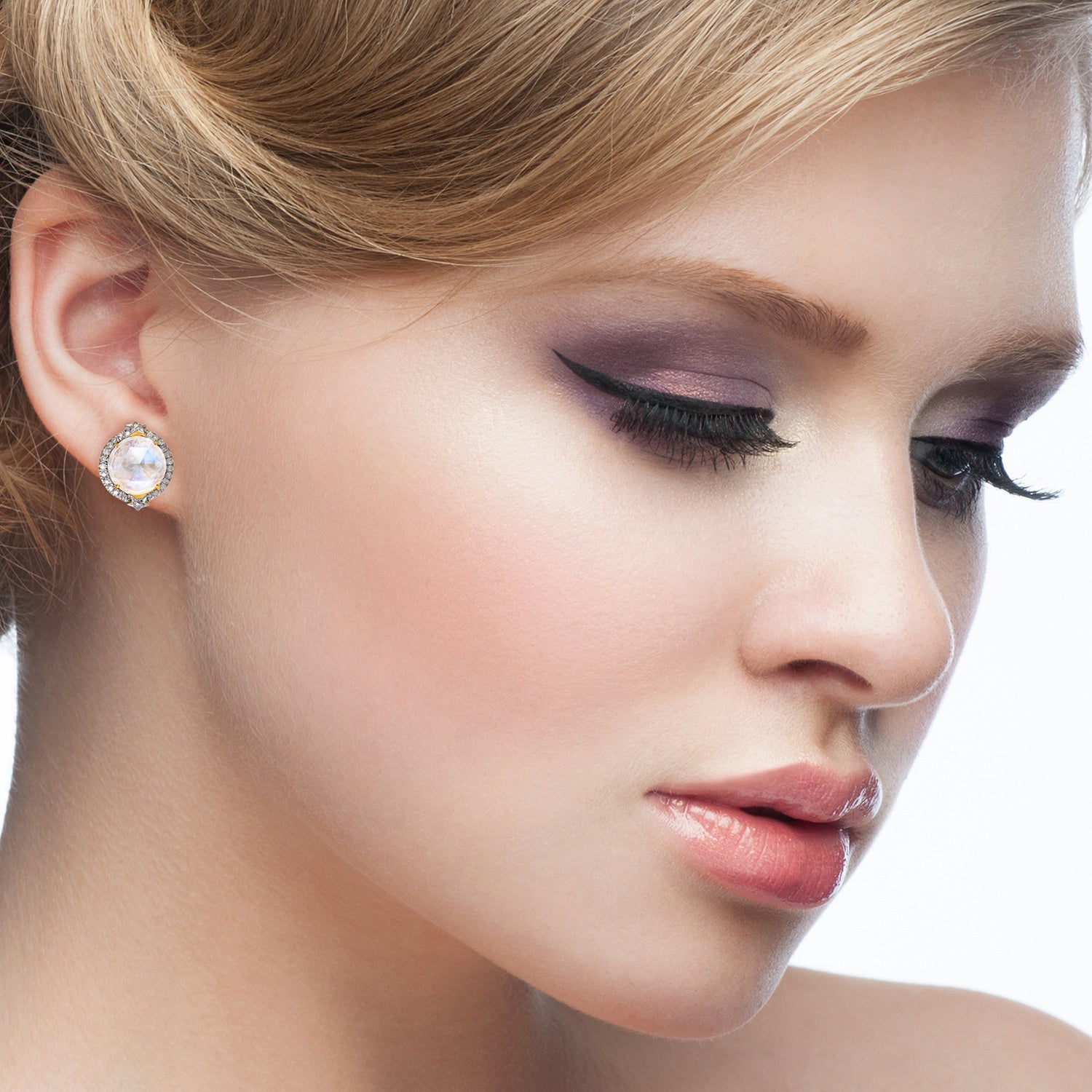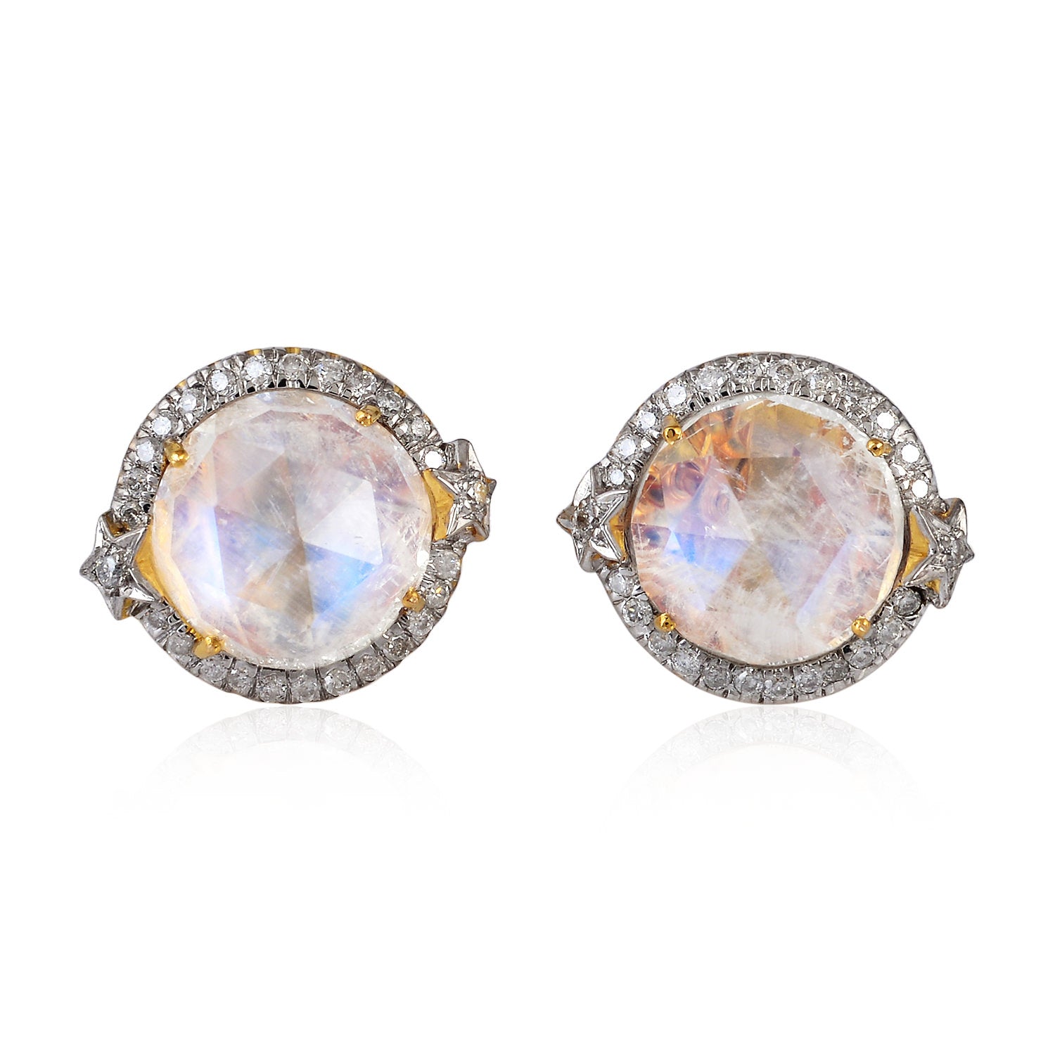 • Round Rainbow Moonstone & Diamond Halo Stud Earrings in 18K Gold