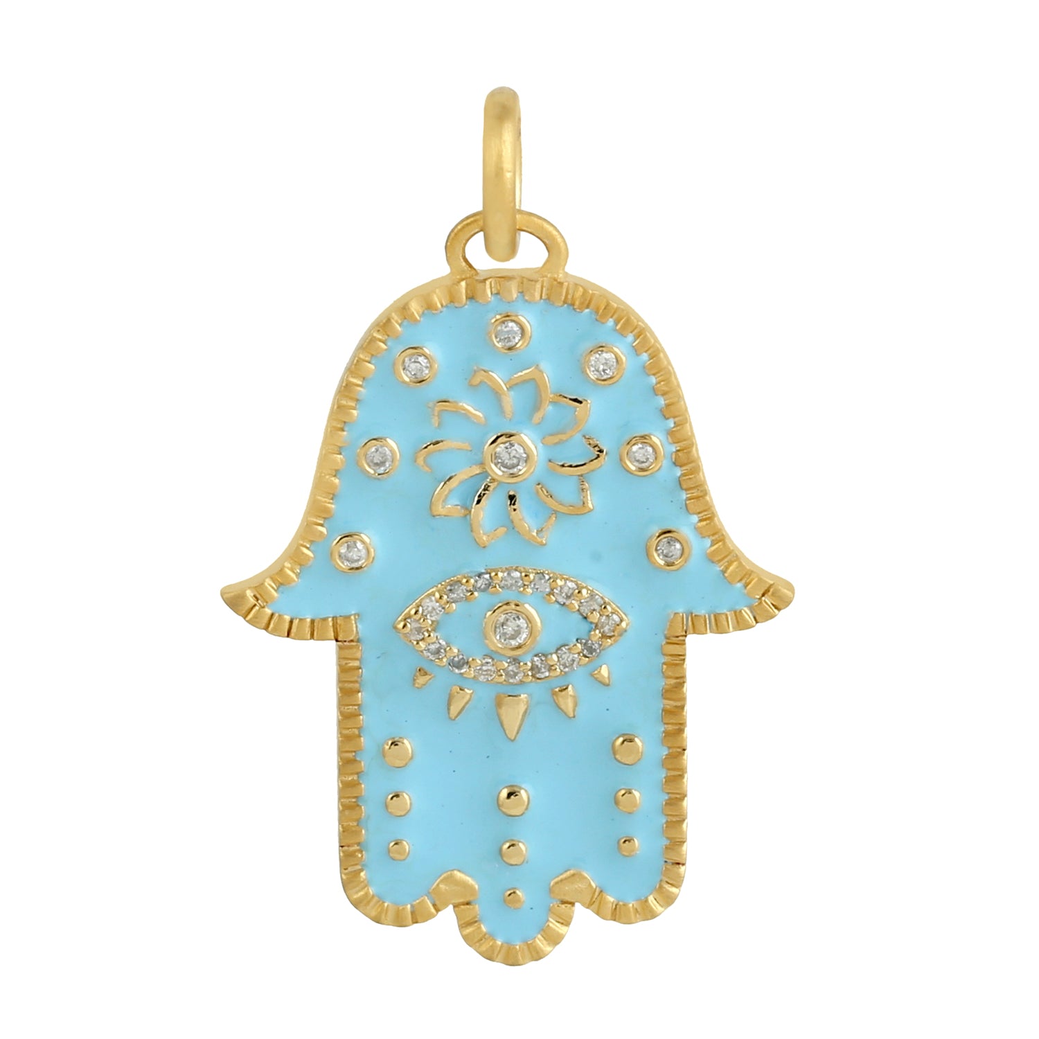 Bezel Set Diamond Hamsa Hand & Evil Eye Enamel Pendant In 14k Yellow Gold For Gift