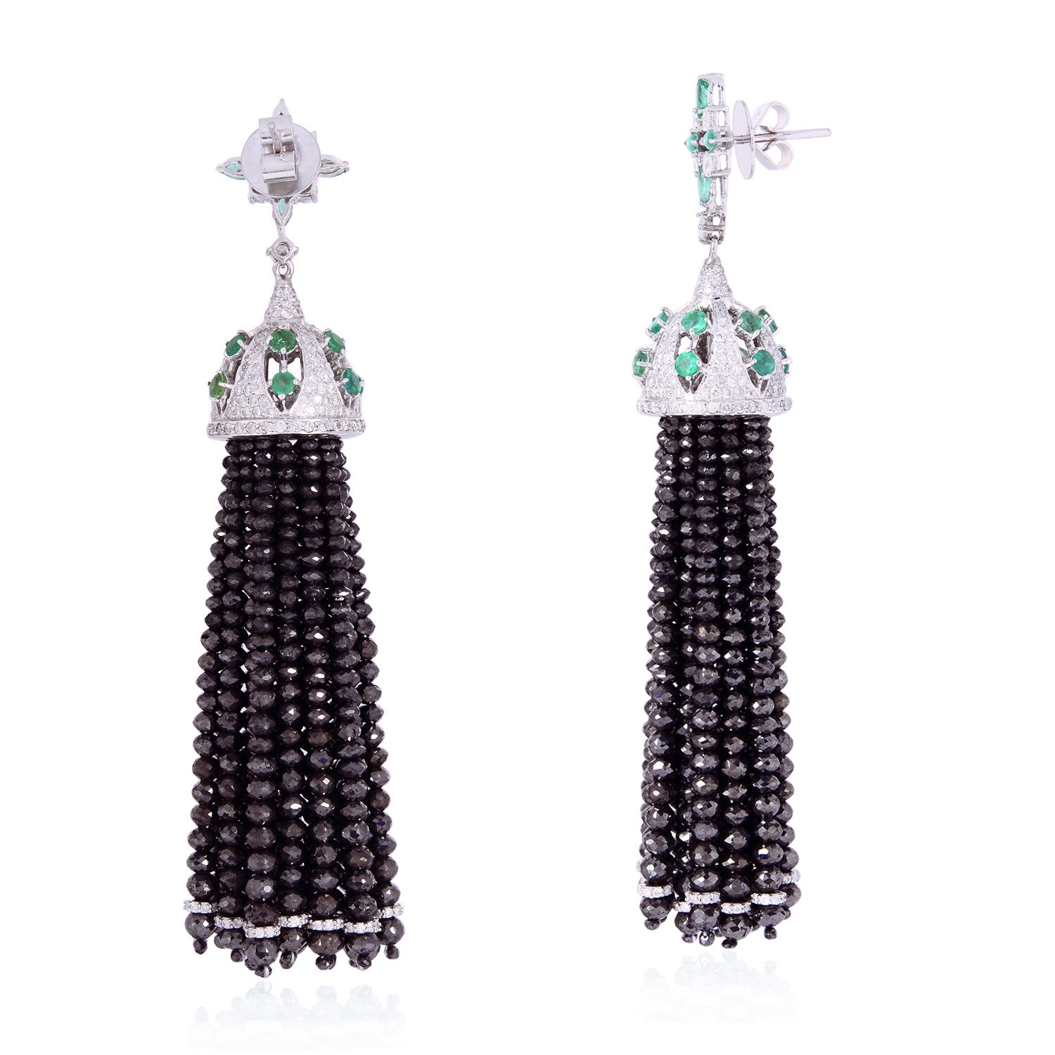 • Black And White Diamond Tassel Earrings with Emerald Accents in 18K White Gold