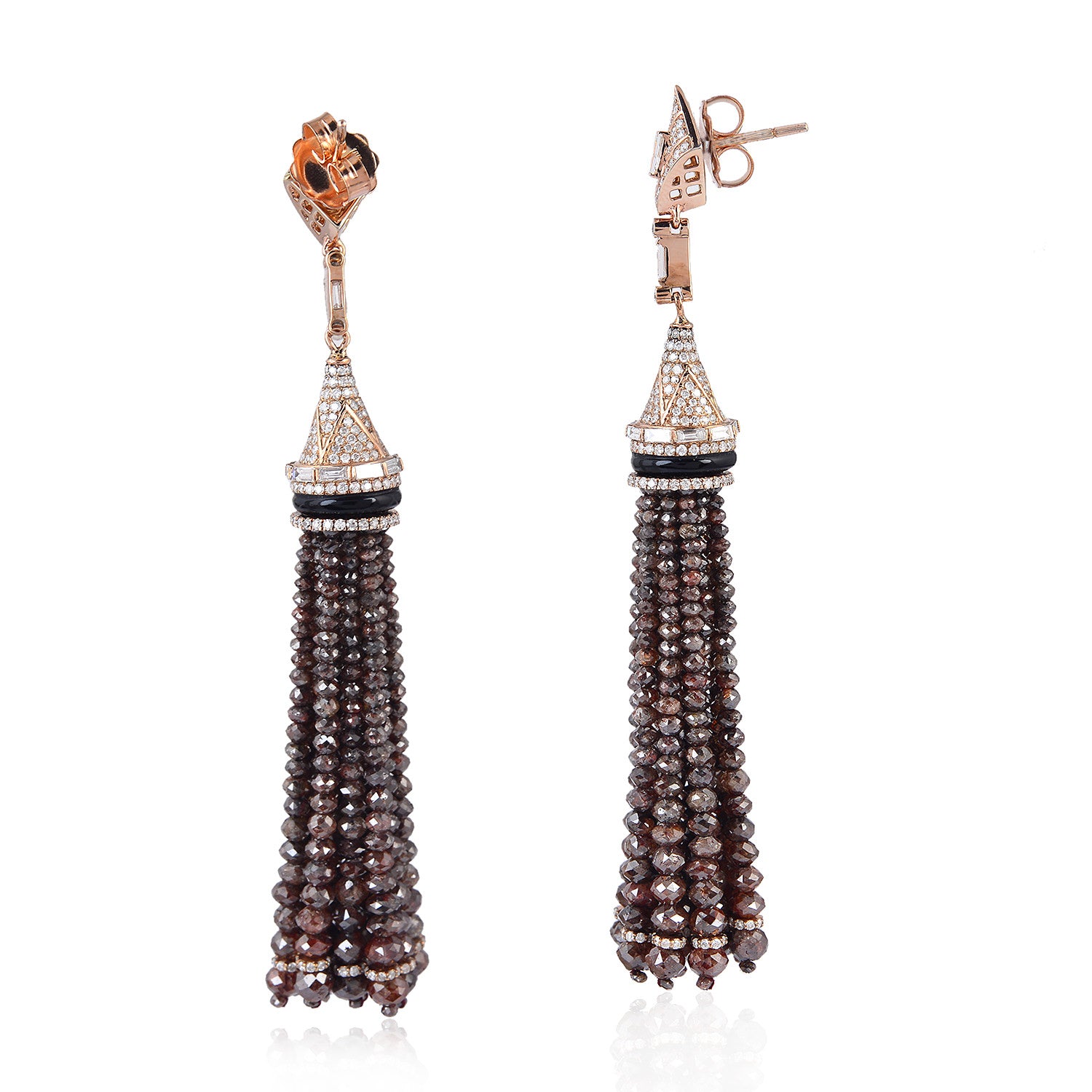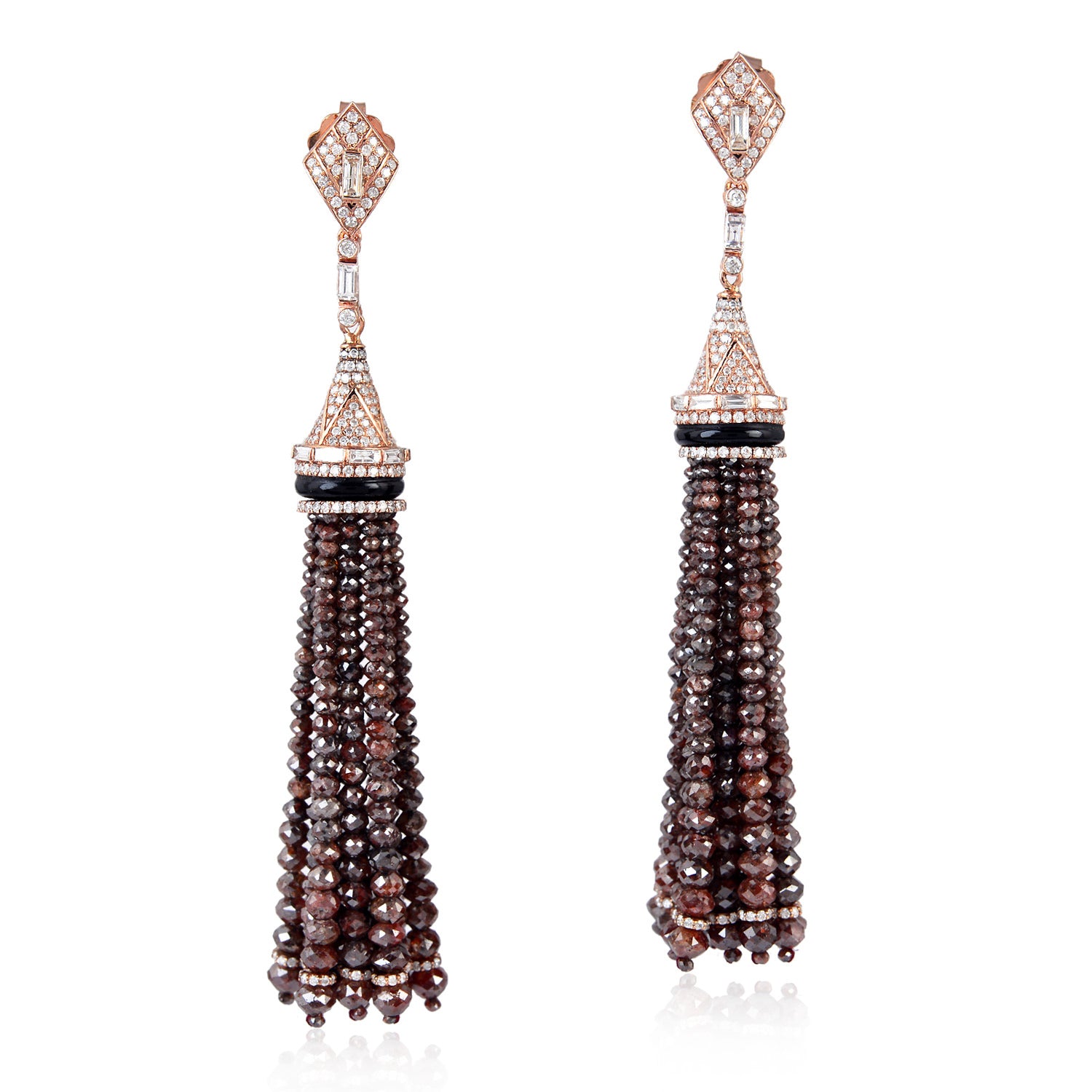 Elegant Rose Gold Tassel Earrings with Baguette Diamonds, Onyx & Faceted Ice Beads