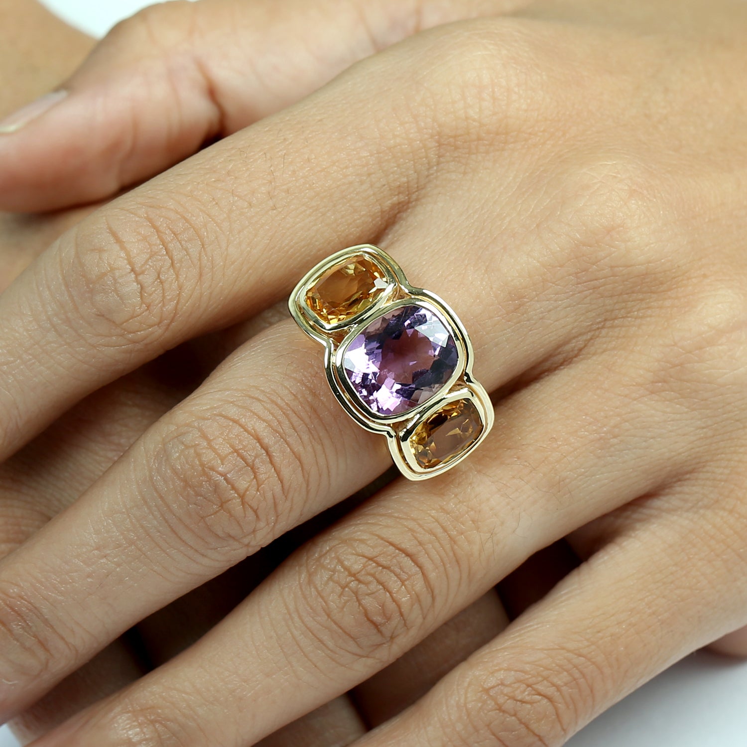 Cushion-Cut Amethyst & Citrine Three-Stone Ring in 18K Yellow Gold