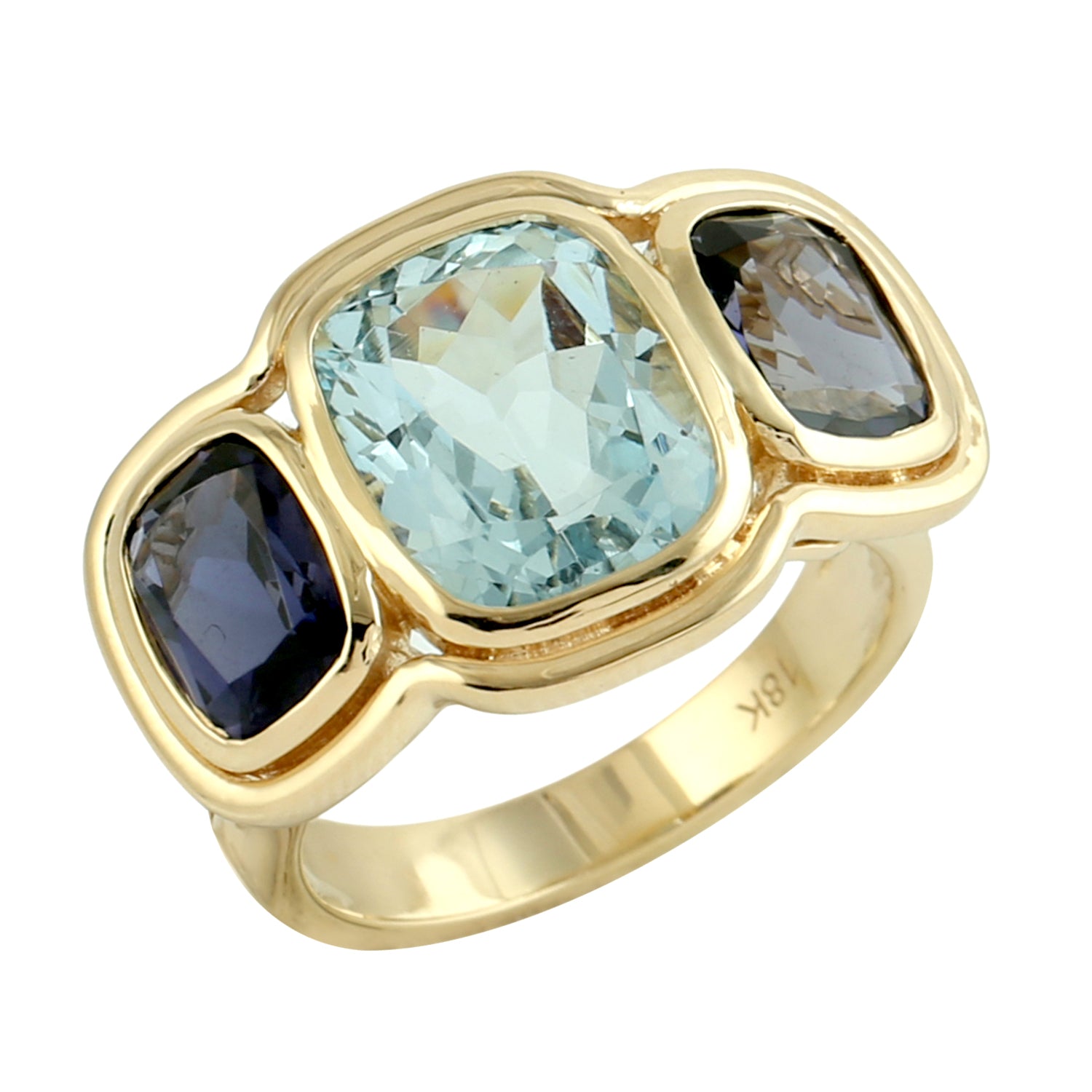 Cushion-Cut Aquamarine & Iolite Three-Stone Ring in 18K Yellow Gold