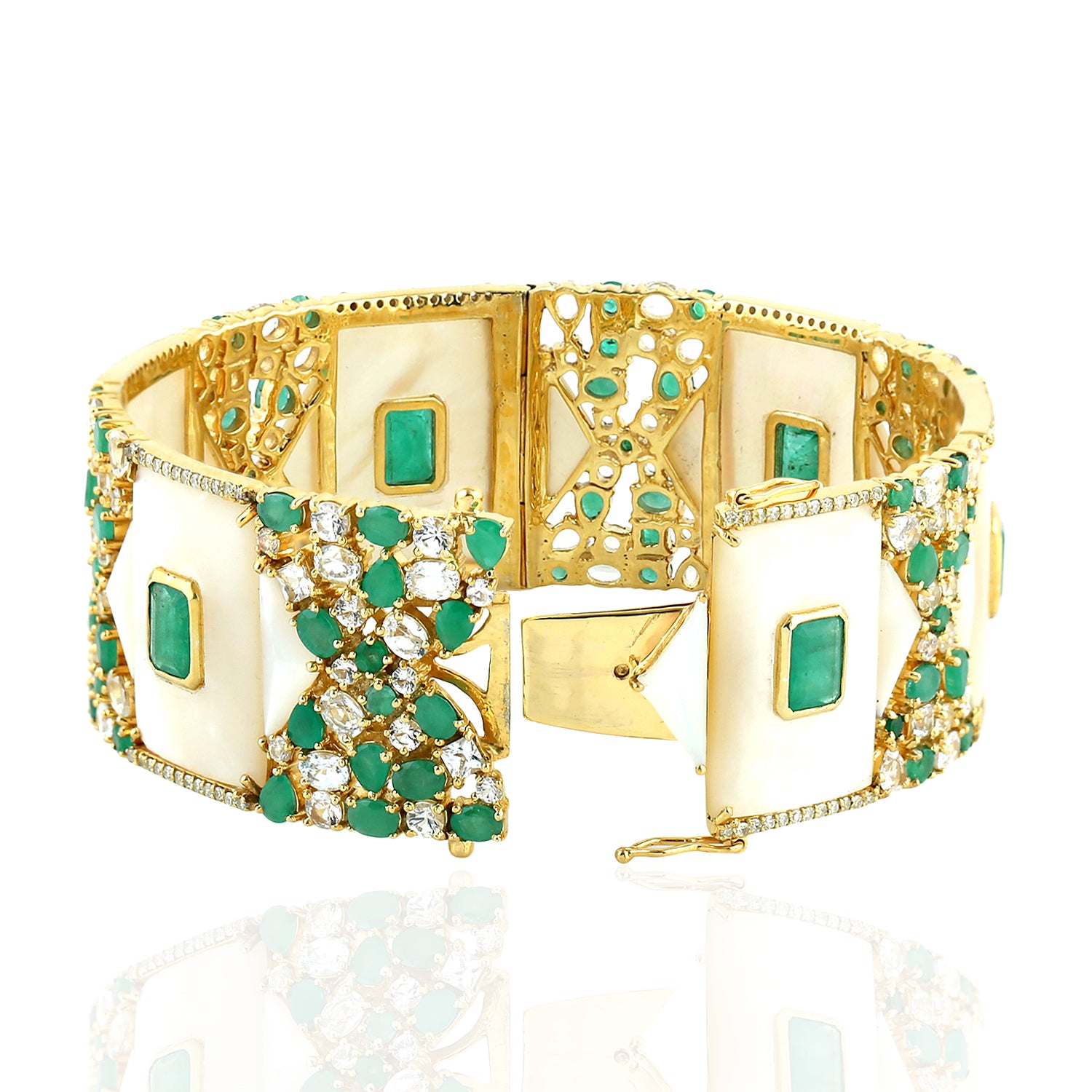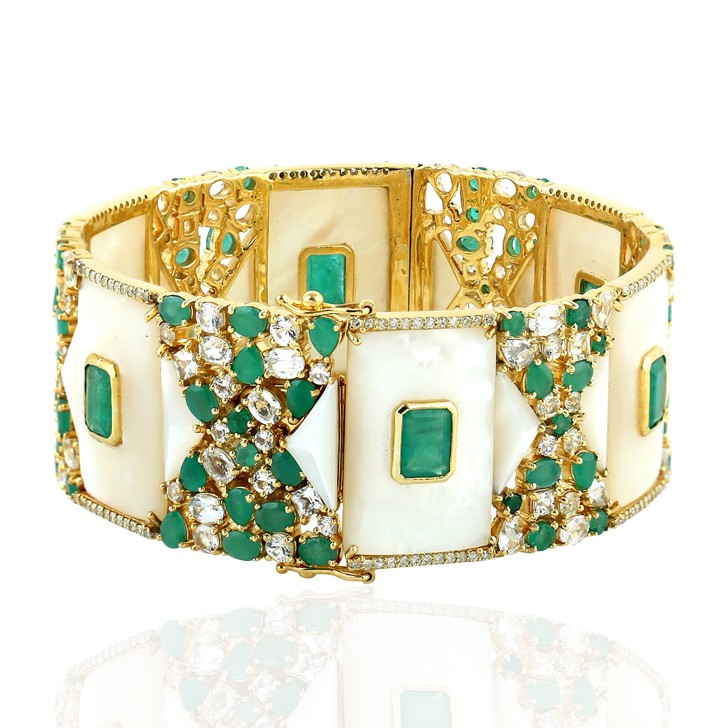 Emerald, Mother of Pearl & Sapphire Diamond Statement Bangle in 18K Gold Silver