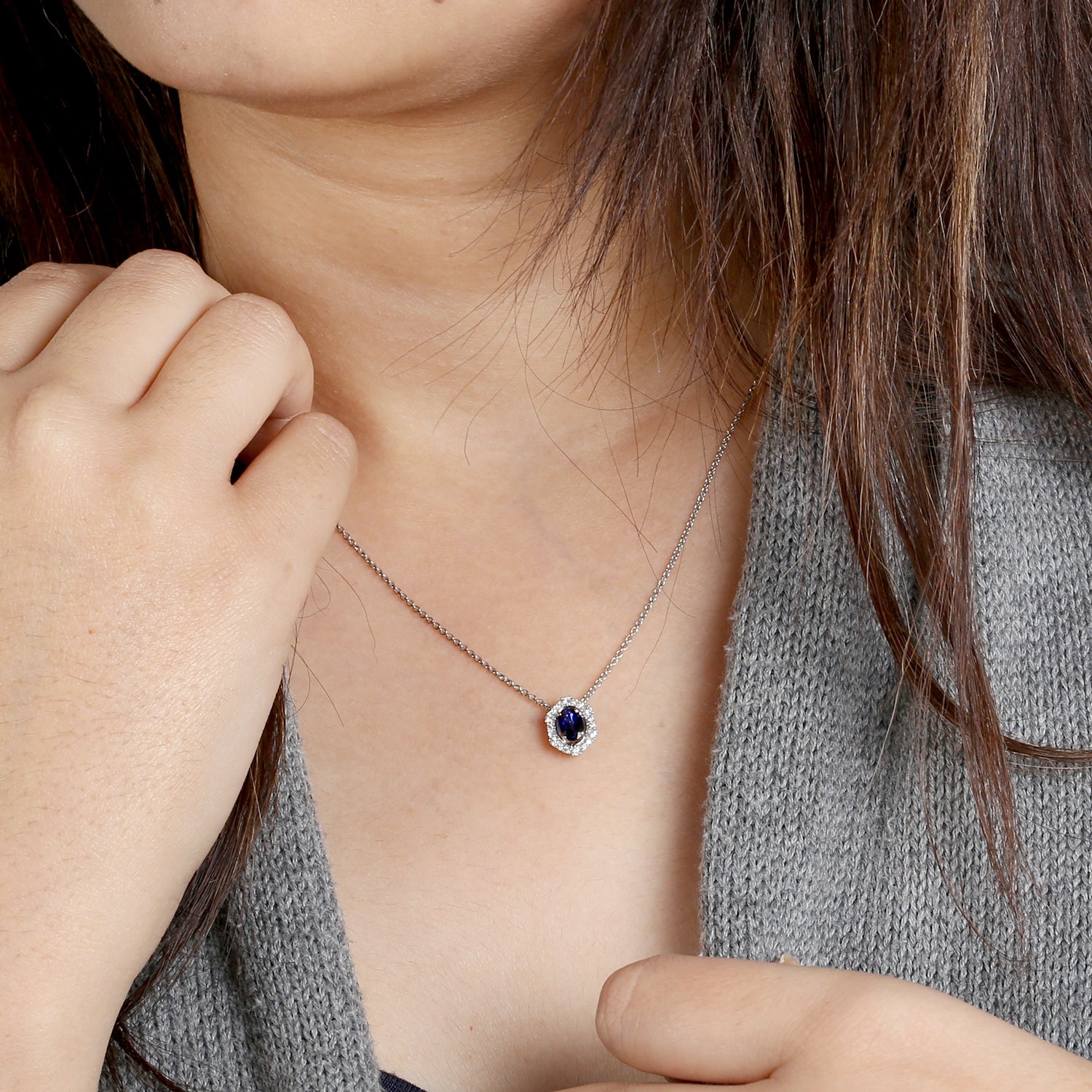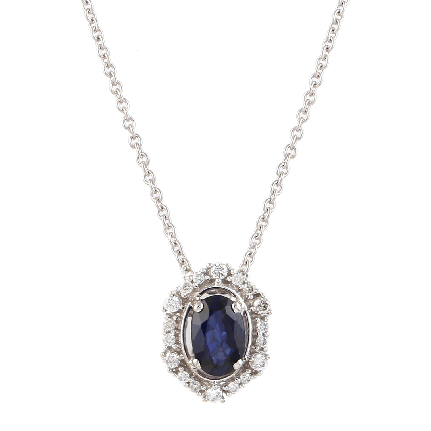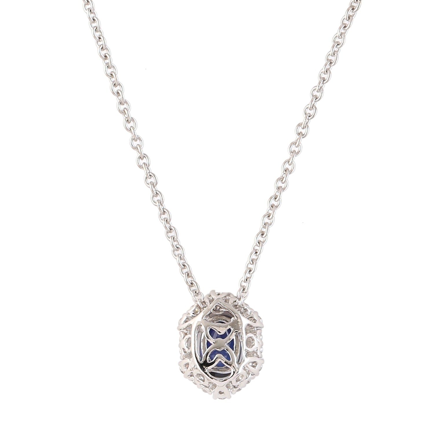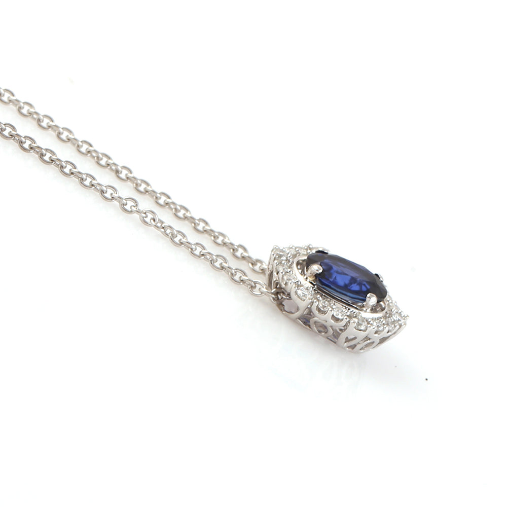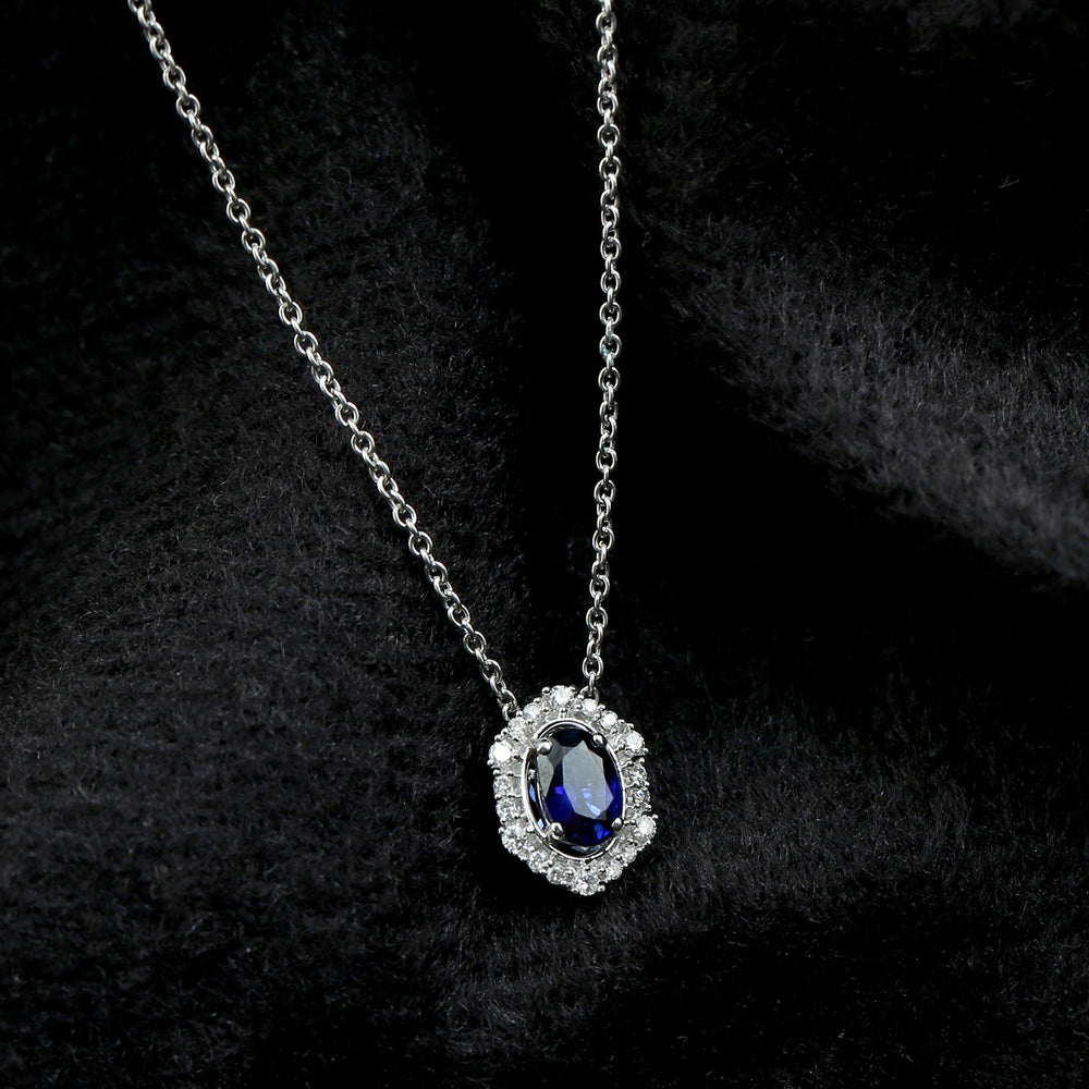 14K White Gold Blue Sapphire Pave Diamond Halo Princess Chain Necklace for Women